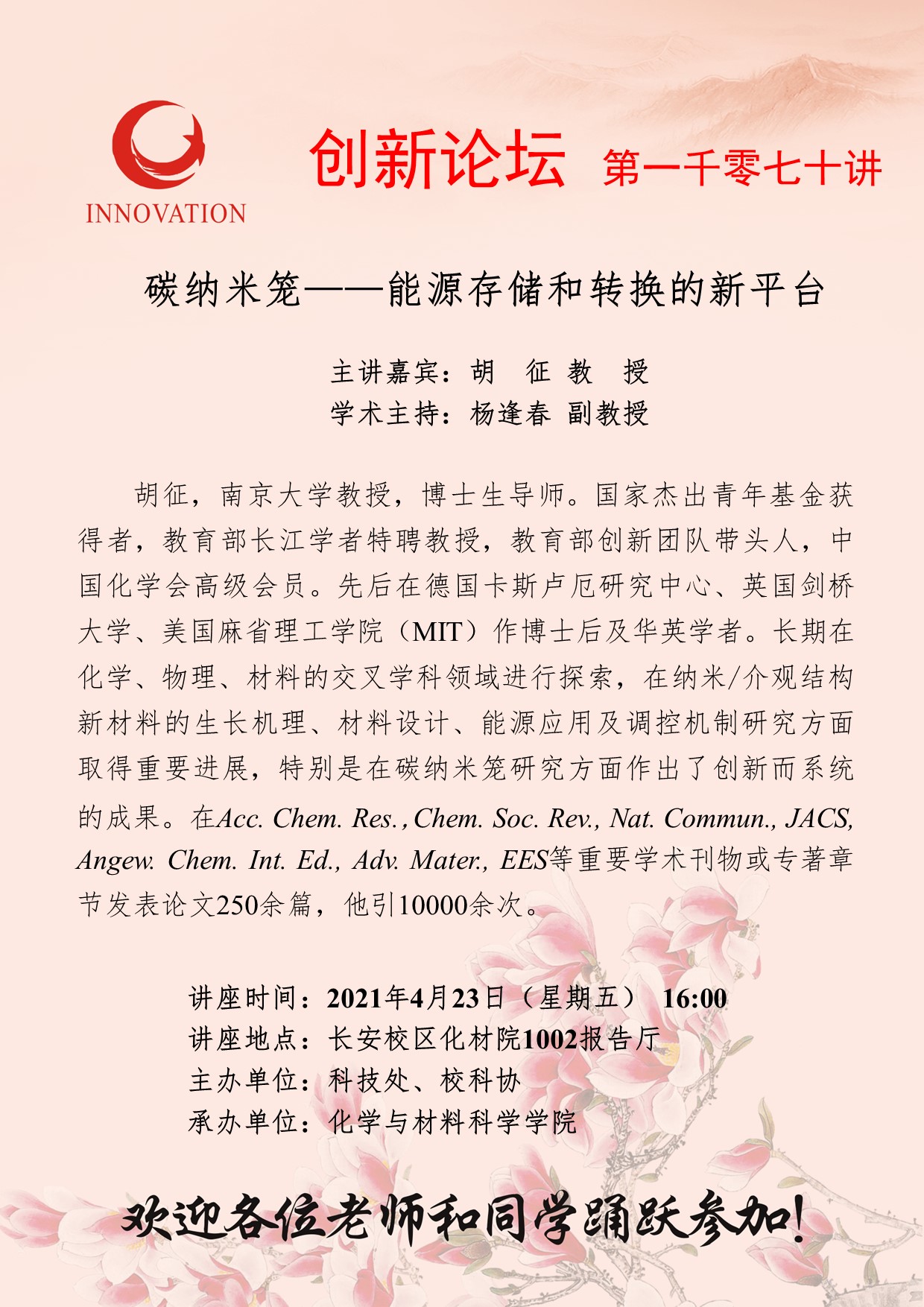 胡征 教授 BB平台创新论坛第一千零七十讲:碳纳米笼——能源存储和转换的新平台 讲座时间 2021年4月23日(星期五) 16:00 讲座地点 长安校区化材院1002报告厅 讲座人介绍 胡征 教授 讲座内容