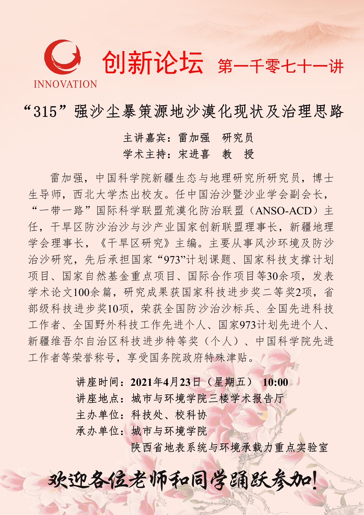雷加强 研究员 BB平台创新论坛第一千零七十一讲:“315”强沙尘暴策源地沙漠化现状及治理思路 讲座时间 2021年4月23日(星期五) 10:00 讲座地点 城市与环境学院三楼学术报告厅 讲座人介绍 雷加强 研究员 讲座内容