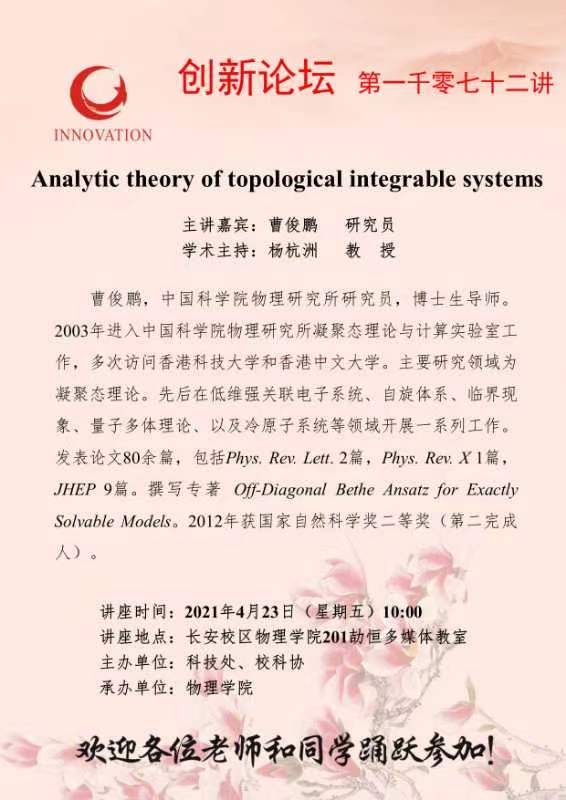 曹俊鹏 研究员 BB平台创新论坛第一千零七十二讲:Analytic theory of topological integrable systems 讲座时间 2021年4月23日(星期五)10:00 讲座地点 长安校区物理学院201劼恒多媒体教室 讲座人介绍 曹俊鹏 研究员 讲座内容