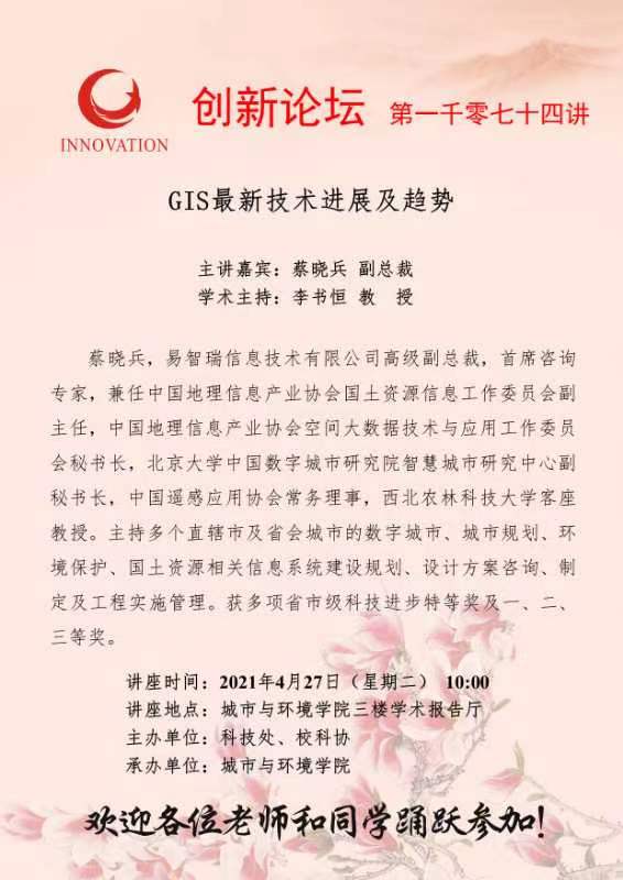 蔡晓兵 副总裁 BB平台创新论坛第一千零七十四讲:GIS最新技术进展及趋势 讲座时间 2021年4月27日(星期二) 10:00 讲座地点 城市与环境学院三楼学术报告厅 讲座人介绍 蔡晓兵 副总裁 讲座内容
