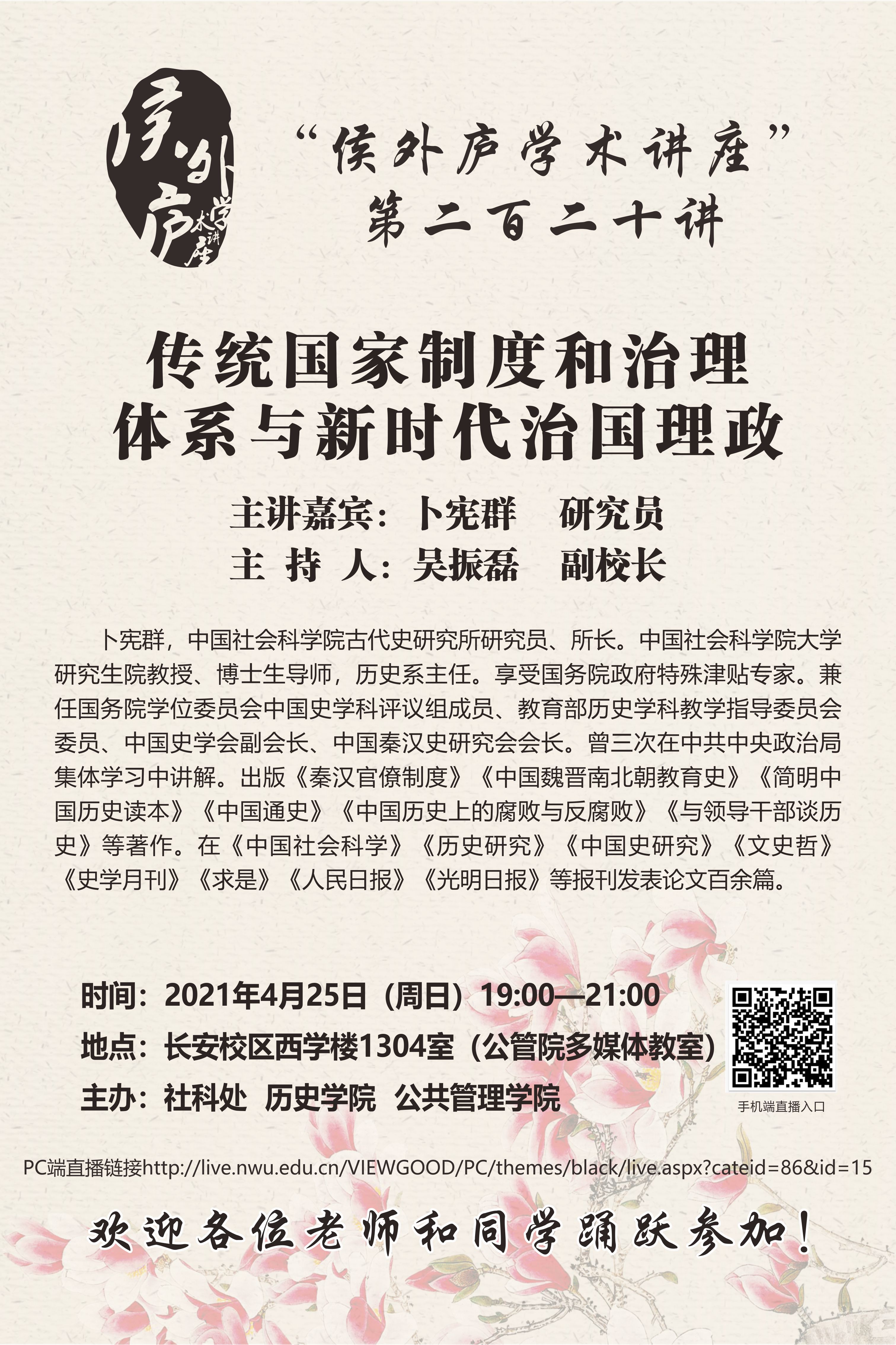 卜宪群 研究员 侯外庐学术讲座第二百二十讲:传统国家制度和治理体系与新时代治国理政 讲座时间 2021年4月25日(周日)19:00 讲座地点 长安校区西学楼1304室 讲座人介绍 卜宪群 研究员 讲座内容