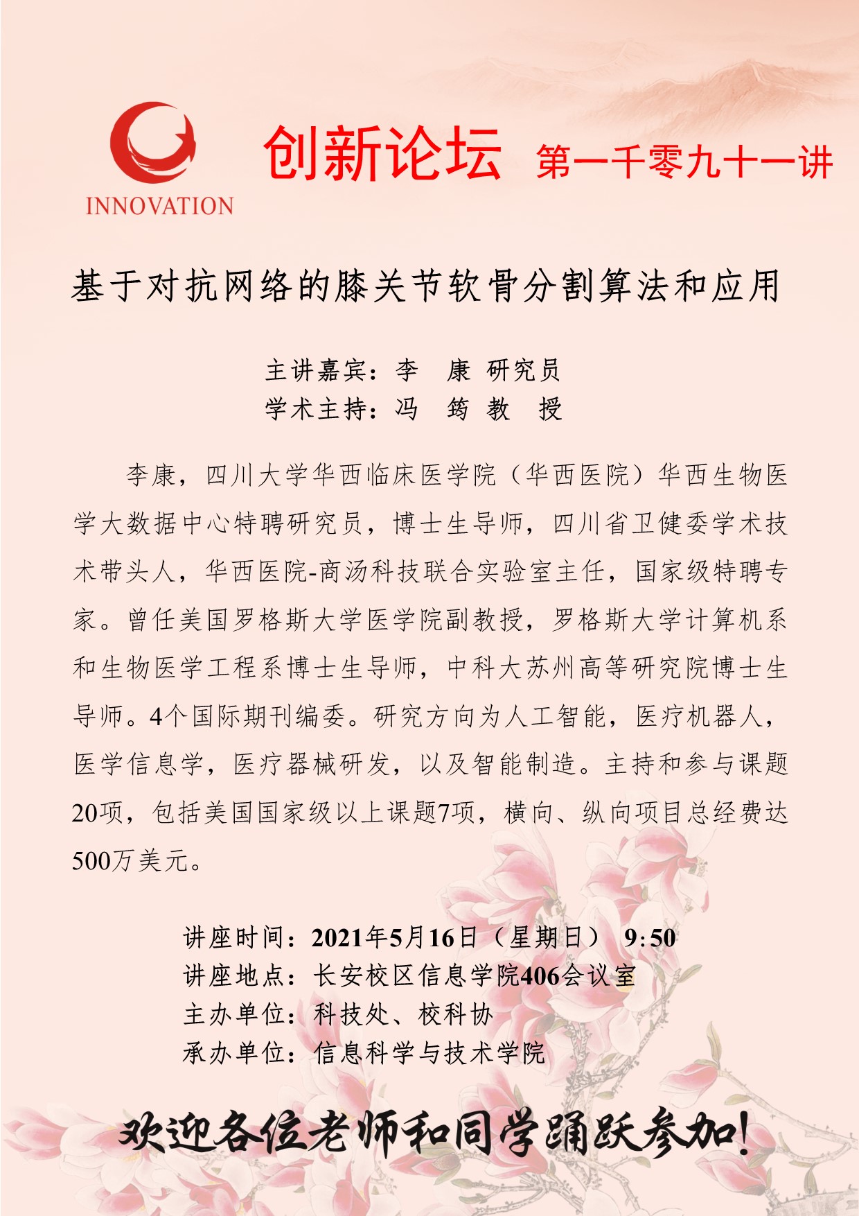 李 康 研究员 BB平台创新论坛第一千零九十一讲:基于对抗网络的膝关节软骨分割算法和应用 讲座时间 2021年5月16日(星期日) 9:50 讲座地点 长安校区信息学院406会议室 讲座人介绍 李 康 研究员 讲座内容