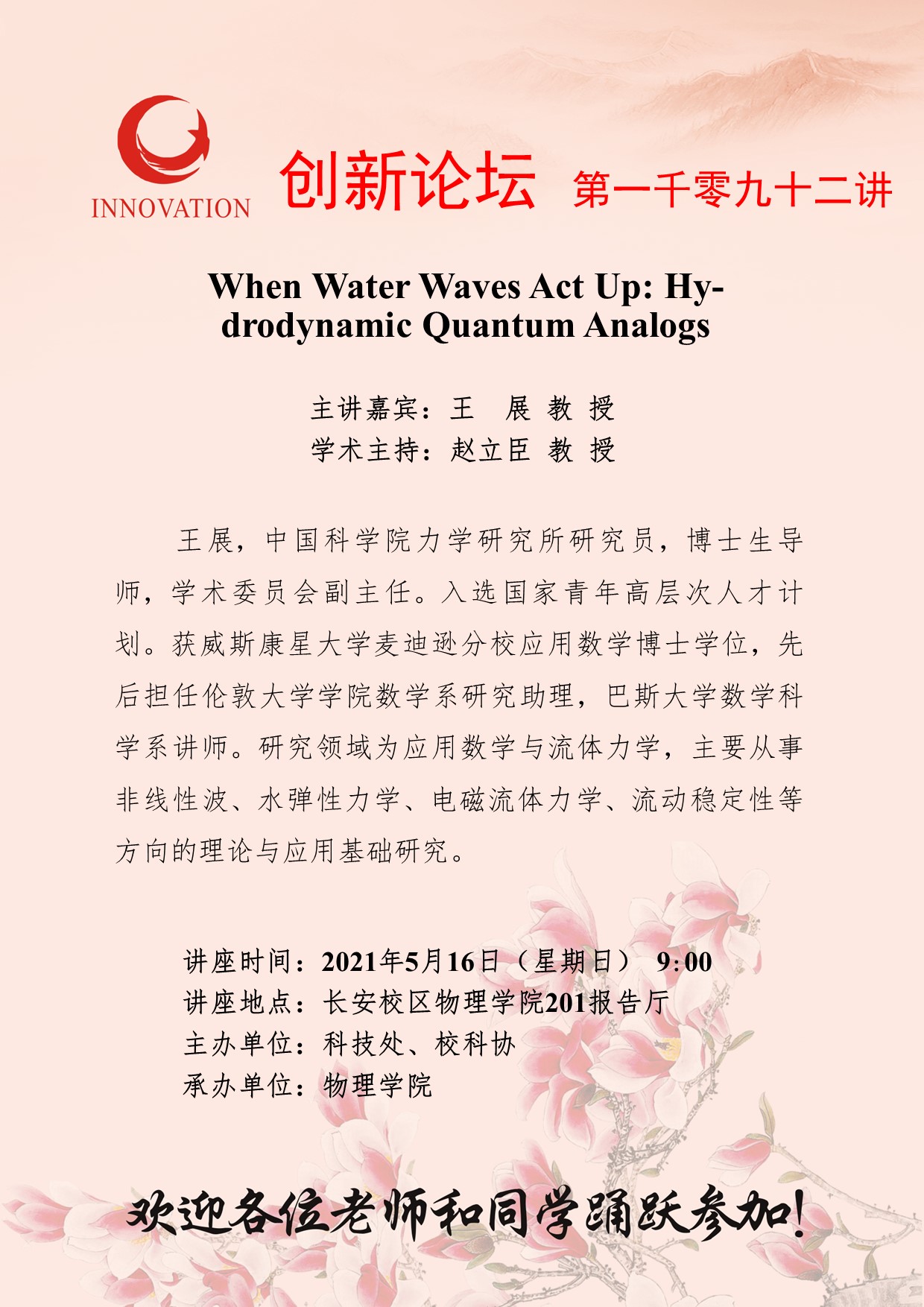 王 展 教 授 BB平台创新论坛第一千零九十二讲:When Water Waves Act Up: Hydrodynamic Quantum Analogs 讲座时间 2021年5月16日(星期日) 9:00 讲座地点 长安校区物理学院201报告厅 讲座人介绍 王 展 教 授 讲座内容