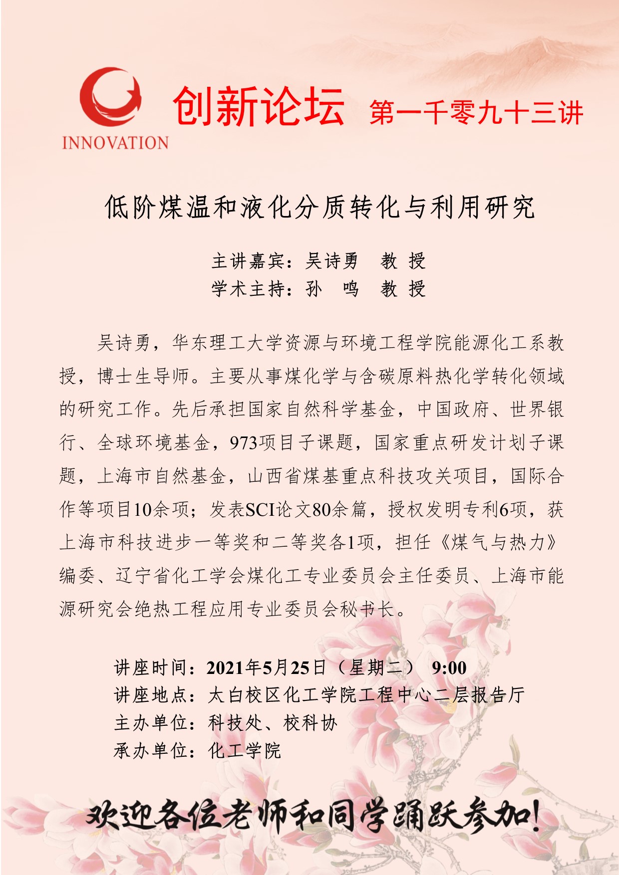 吴诗勇 教 授 BB平台创新论坛第一千零九十三讲:低阶煤温和液化分质转化与利用研究 讲座时间 2021年5月25日(星期二) 9:00 讲座地点 太白校区化工学院工程中心二层报告厅 讲座人介绍 吴诗勇 教 授 讲座内容