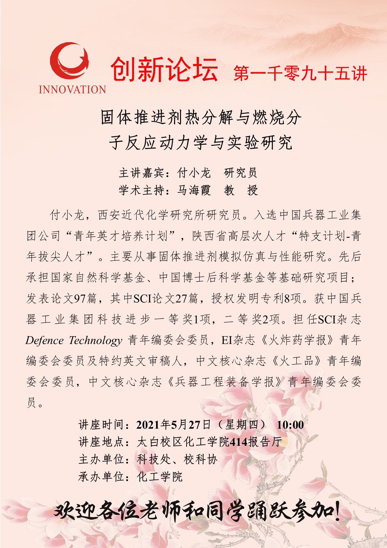 付小龙 研究员 BB平台创新论坛第一千零九十五讲:固体推进剂热分解与燃烧分子反应动力学与实验研究 讲座时间 2021年5月27日(星期四) 10:00 讲座地点 太白校区化工学院414报告厅 讲座人介绍 付小龙 研究员 讲座内容