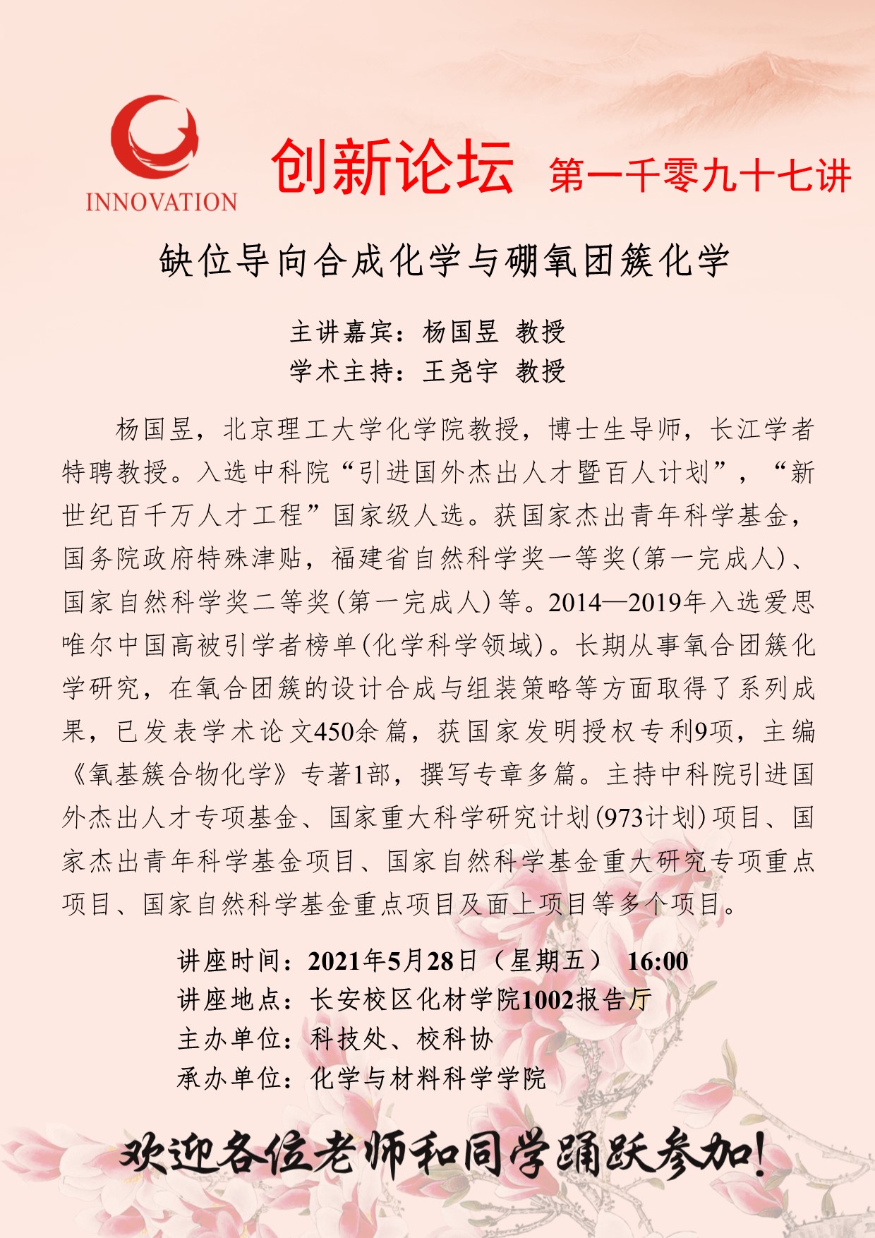 杨国昱 教授 BB平台创新论坛第一千零九十七讲:缺位导向合成化学与硼氧团簇化学 讲座时间 2021年5月28日(星期五) 16:00 讲座地点 长安校区化材学院1002报告厅 讲座人介绍 杨国昱 教授 讲座内容
