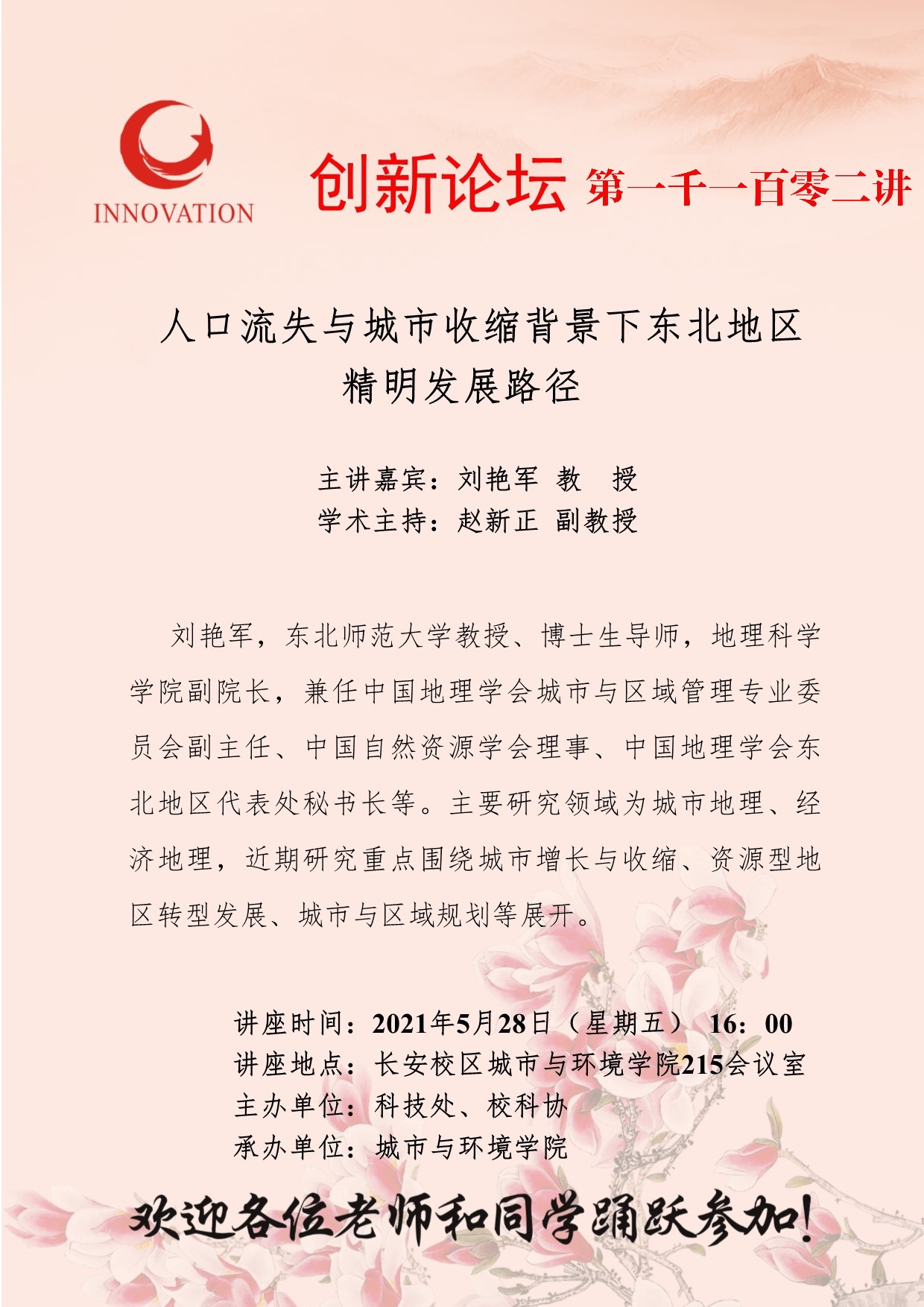 刘艳军 教授 BB平台创新论坛第一千一百零二讲:人口流失与城市收缩背景下东北地区精明发展路径 讲座时间 2021年5月28日(星期五)16:00 讲座地点 长安校区城市与环境学院215会议室 讲座人介绍 刘艳军 教授 讲座内容