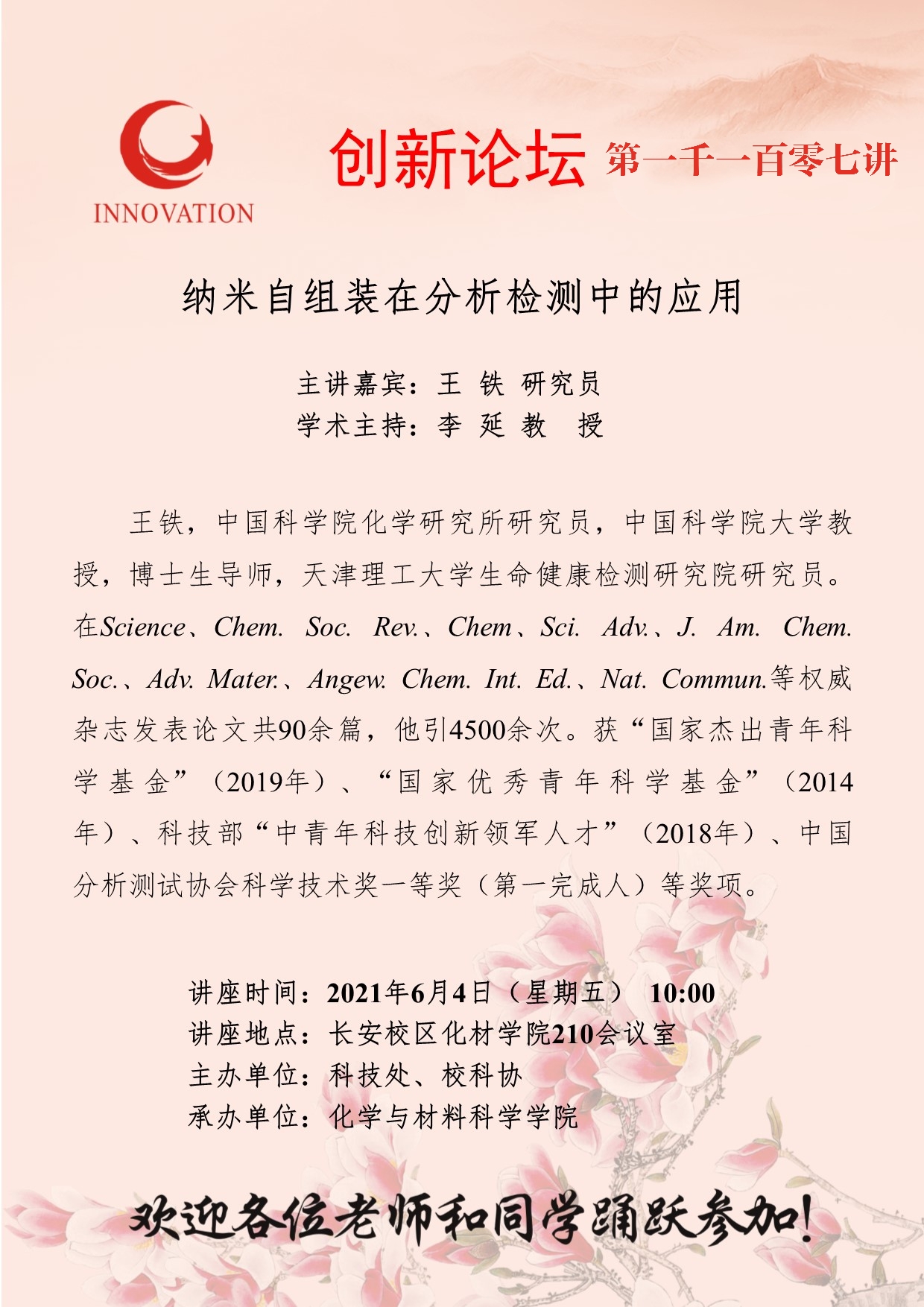 王 铁 研究员 BB平台创新论坛第一千一百零七讲:纳米自组装在分析检测中的应用 讲座时间 2021年6月4日(星期五) 10:00 讲座地点 长安校区化材学院210会议室 讲座人介绍 王 铁 研究员 讲座内容