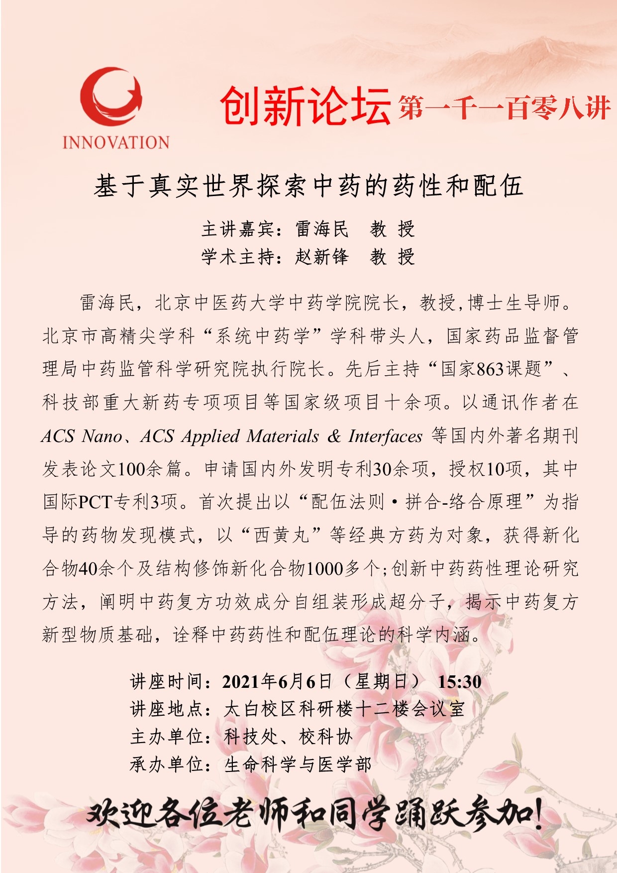雷海民 教 授 BB平台创新论坛第一千一百零八讲:基于真实世界探索中药的药性和配伍 讲座时间 2021年6月6日(星期日) 15:30 讲座地点 太白校区科研楼十二楼会议室 讲座人介绍 雷海民 教 授 讲座内容