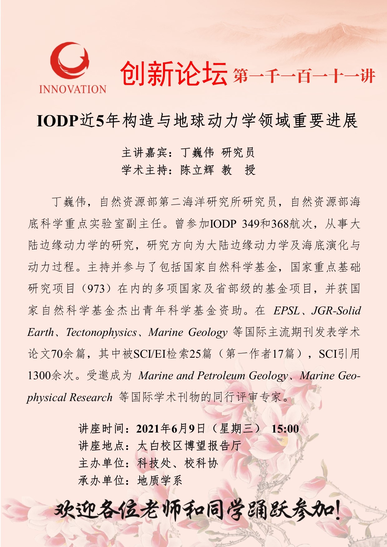 丁巍伟 研究员 BB平台创新论坛第一千一百一十一讲:IODP近5年构造与地球动力学领域重要进展 讲座时间 2021年6月9日(星期三) 15:00 讲座地点 太白校区博望报告厅 讲座人介绍 丁巍伟 研究员 讲座内容
