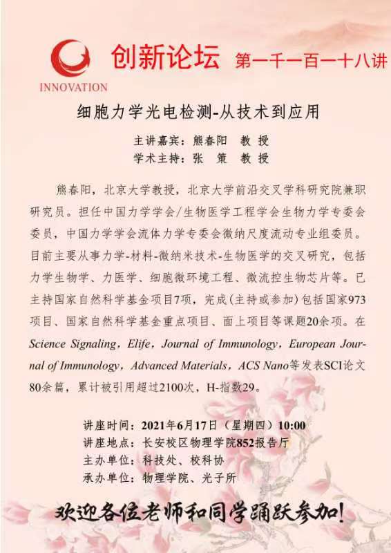 熊春阳 教 授 BB平台创新论坛第一千一百一十八讲:细胞力学光电检测-从技术到应用 讲座时间 2021年6月17日(星期四)10:00 讲座地点 长安校区物理学院852报告厅 讲座人介绍 熊春阳 教 授 讲座内容