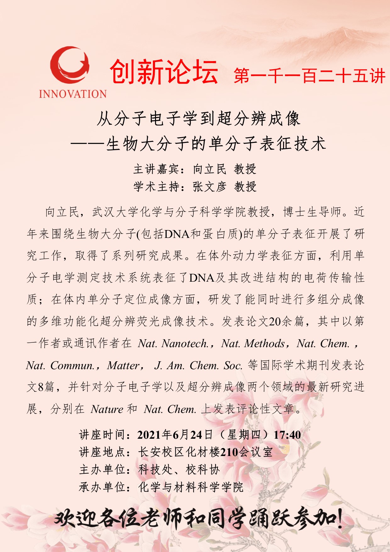 向立民 教授 BB平台创新论坛第一千一百二十五讲:从分子电子学到超分辨成像——生物大分子的单分子表征技术 讲座时间 2021年6月24日(星期四)17:40 讲座地点 长安校区化材楼210会议室 讲座人介绍 向立民 教授 讲座内容