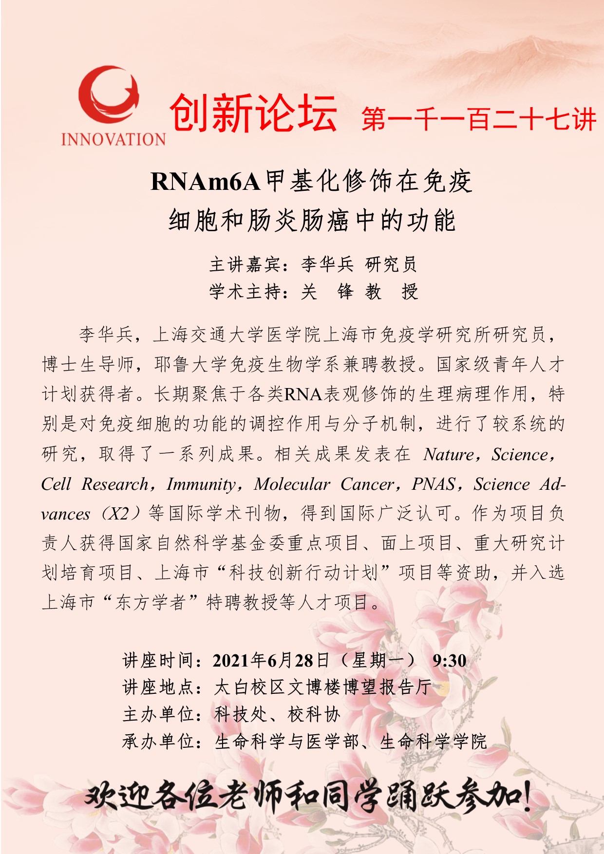 李华兵 研究员 BB平台创新论坛第一千一百二十七讲:RNAm6A甲基化修饰在免疫细胞和肠炎肠癌中的功能 讲座时间 2021年6月28日(星期一) 9:30 讲座地点 太白校区文博楼博望报告厅 讲座人介绍 李华兵 研究员 讲座内容