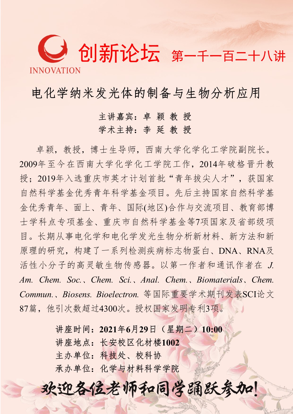 卓 颖 教 授 BB平台创新论坛第一千一百二十八讲:电化学纳米发光体的制备与生物分析应用 讲座时间 2021年6月29日(星期二)10:00 讲座地点 长安校区化材楼1002 讲座人介绍 卓 颖 教 授 讲座内容