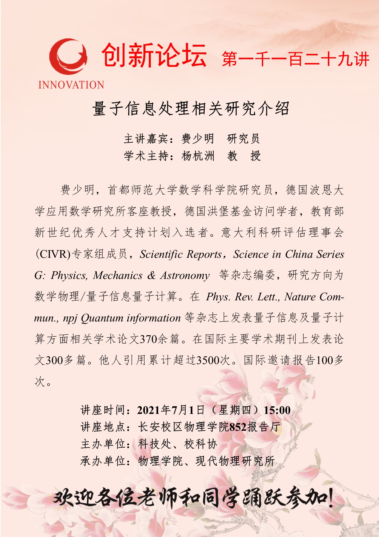 费少明 研究员 BB平台创新论坛第一千一百二十九讲:量子信息处理相关研究介绍 讲座时间 2021年7月1日(星期四)15:00 讲座地点 长安校区物理学院852报告厅 讲座人介绍 费少明 研究员 讲座内容