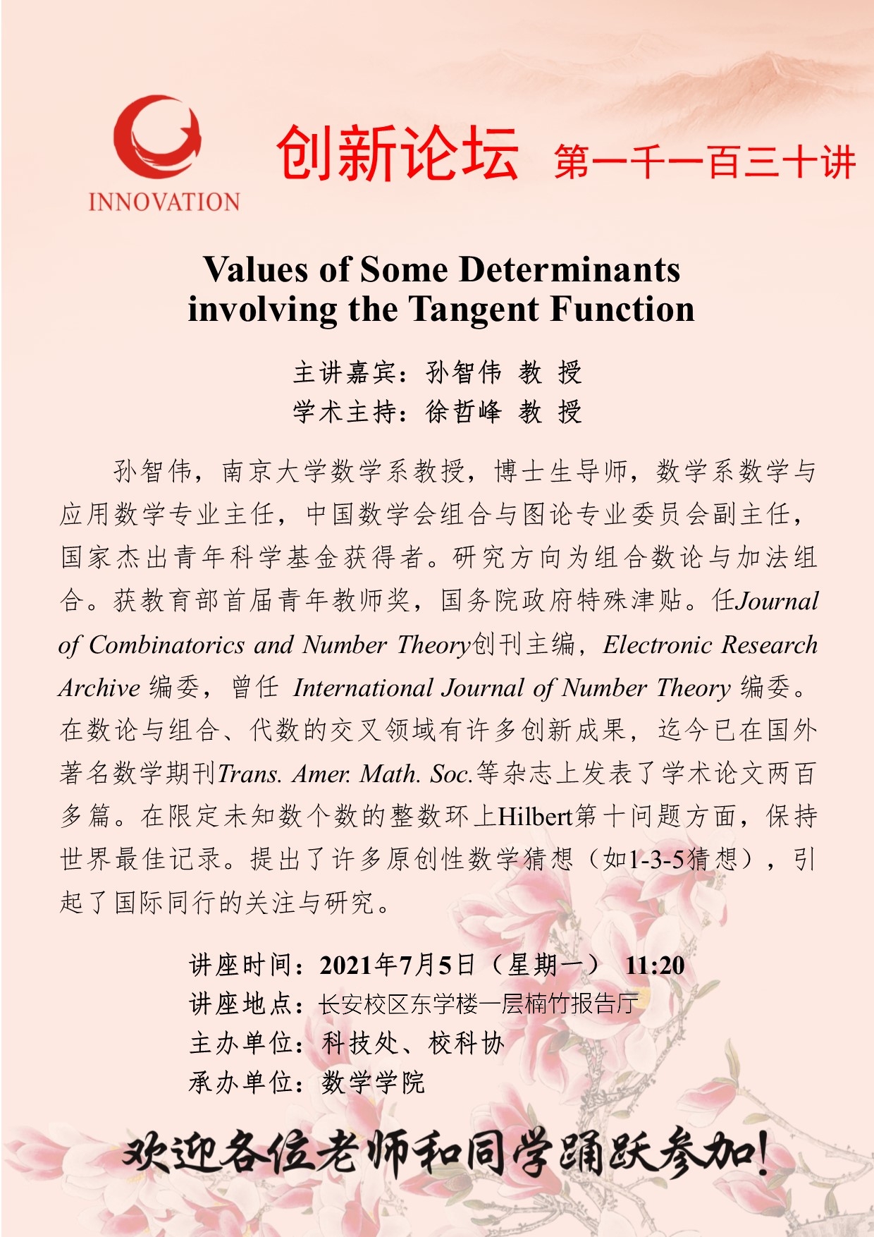 孙智伟 教 授 BB平台创新论坛第一千一百三十讲:Values of Some Determinants involving the Tangent Function 讲座时间 2021年7月5日(星期一) 11:20 讲座地点 长安校区东学楼一层楠竹报告厅 讲座人介绍 孙智伟 教 授 讲座内容