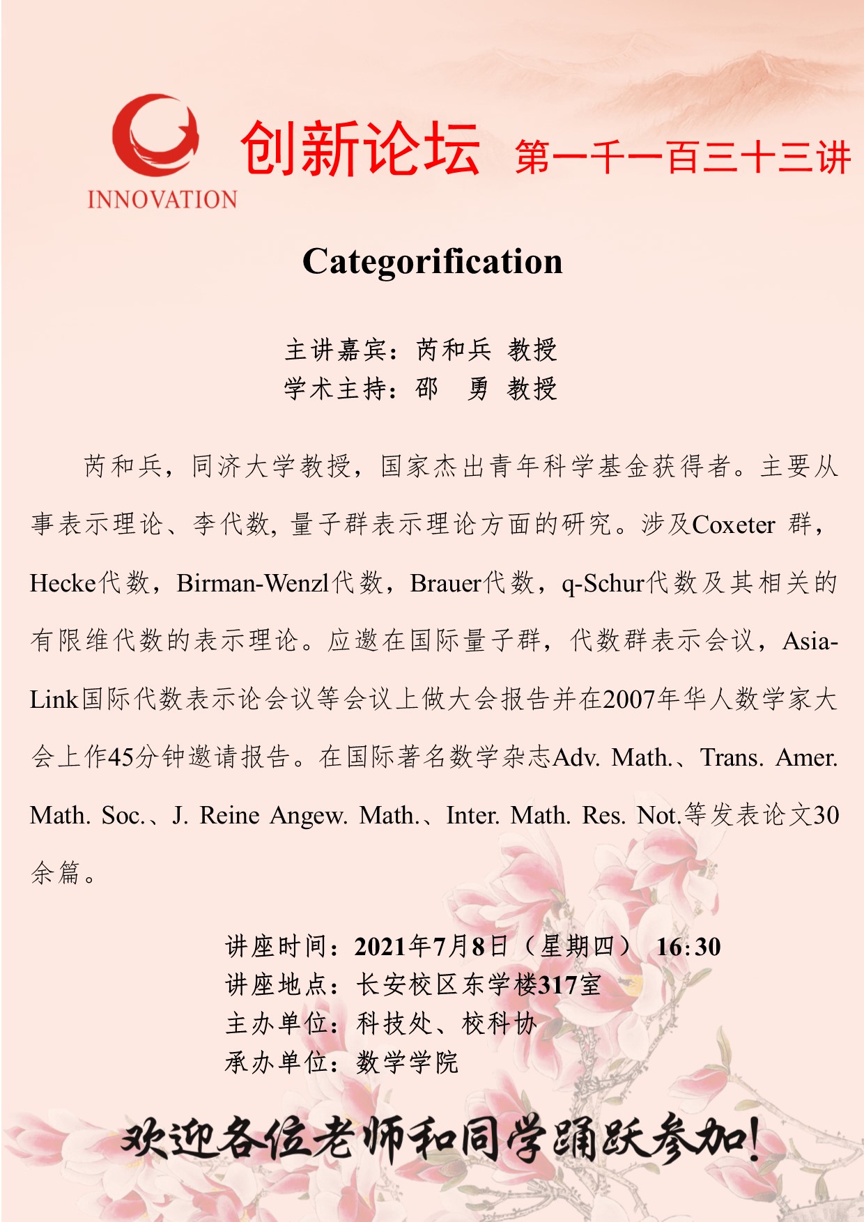 芮和兵 教授 BB平台创新论坛第一千一百三十三讲:Categorification 讲座时间 2021年7月8日(星期四)16:30 讲座地点 长安校区东学楼317室 讲座人介绍 芮和兵 教授 讲座内容
