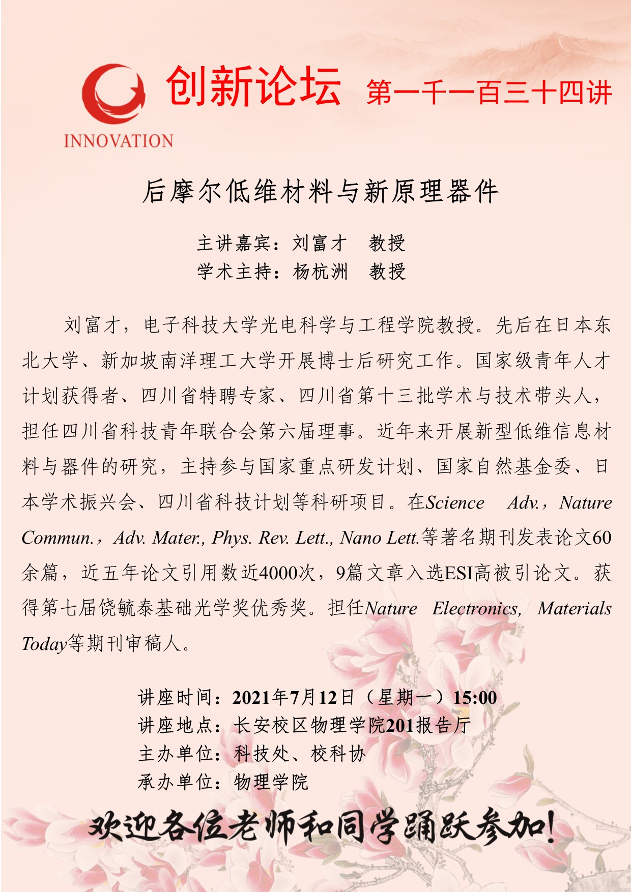 刘富才 教授 BB平台创新论坛第一千一百三十四讲:后摩尔低维材料与新原理器件 讲座时间 2021年7月12日(星期一)15:00 讲座地点 长安校区物理学院201报告厅 讲座人介绍 刘富才 教授 讲座内容