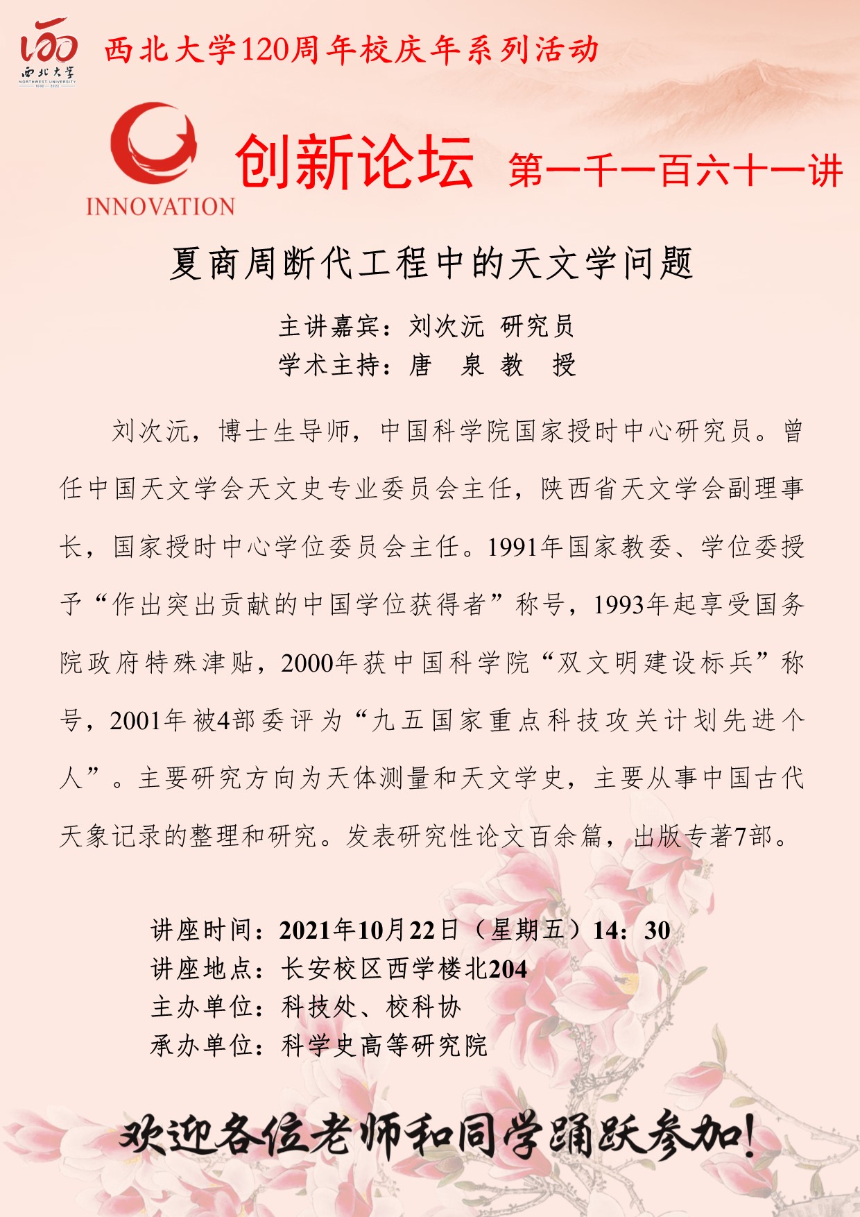 刘次沅 研究员 BB平台创新论坛第一千一百六十一讲暨120周年校庆年系列活动:夏商周断代工程中的天文学问题 讲座时间 2021年10月22日(星期五)14:30 讲座地点 长安校区西学楼北204 讲座人介绍 刘次沅 研究员 讲座内容