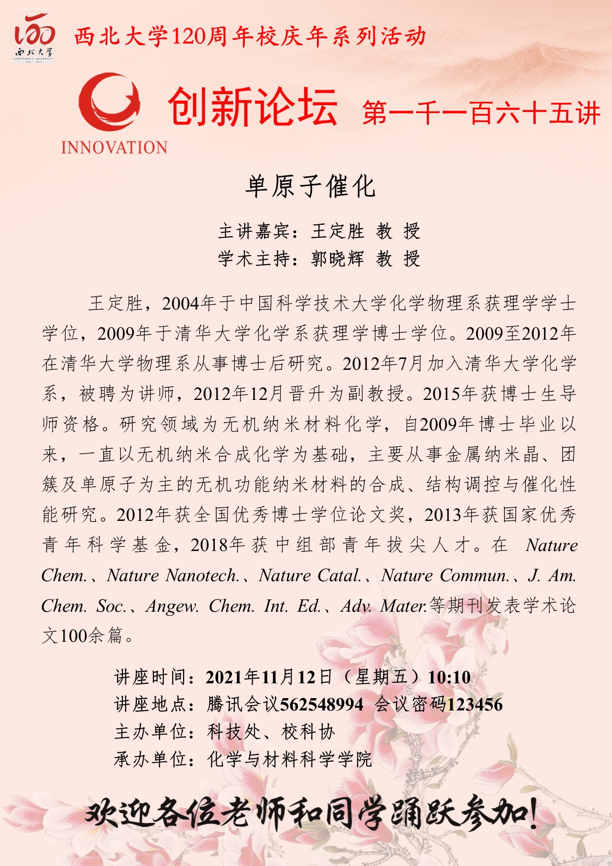 王定胜 教授 BB平台创新论坛第一千一百六十五讲暨120周年校庆年系列活动:单原子催化 讲座时间 2021年11月12日(星期五)10:10 讲座地点 腾讯会议562548994 会议密码123456 讲座人介绍 王定胜 教授 讲座内容