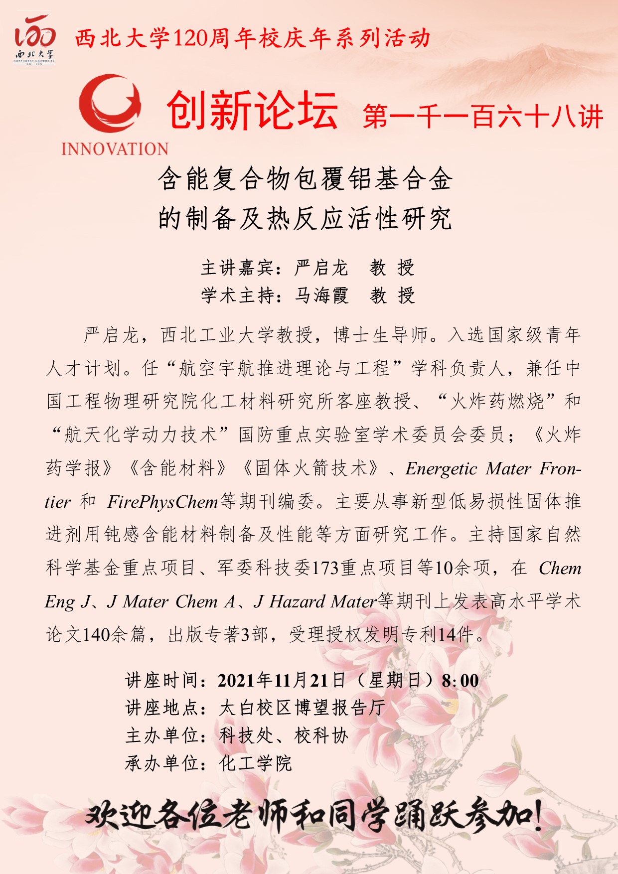严启龙 教授 BB平台创新论坛第一千一百六十八讲暨120周年校庆年系列活动:含能复合物包覆铝基合金的制备及热反应活性研究 讲座时间 2021年11月21日(星期日)8:00 讲座地点 太白校区博望报告厅 讲座人介绍 严启龙 教授 讲座内容