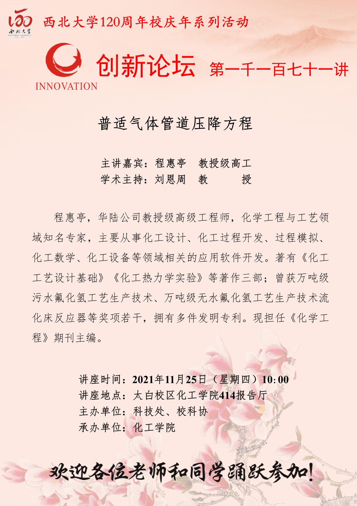 程惠亭 教授级高工 BB平台创新论坛第一千一百七十一讲暨120周年校庆年系列活动:普适气体管道压降方程 讲座时间 2021年11月25日(星期四)10:00 讲座地点 太白校区化工学院414报告厅 讲座人介绍 程惠亭 教授级高工 讲座内容