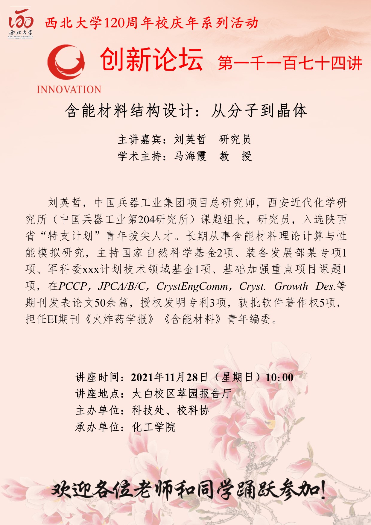 刘英哲 研究员 BB平台创新论坛第一千一百七十四讲暨120周年校庆年系列活动:含能材料结构设计: 从分子到晶体 讲座时间 2021年11月28日(星期日)10:00 讲座地点 太白校区萃园报告厅 讲座人介绍 刘英哲 研究员 讲座内容