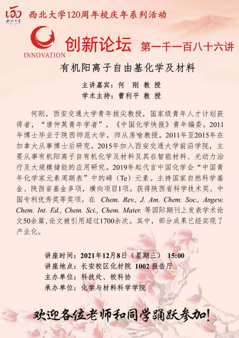 何刚 教授 BB平台创新论坛第一千一百八十六讲暨120周年校庆年系列活动:有机阳离子自由基化学及材料 讲座时间 2021年12月8日(星期三) 15:00 讲座地点 长安校区化材院1002报告厅 讲座人介绍 何刚 教授 讲座内容