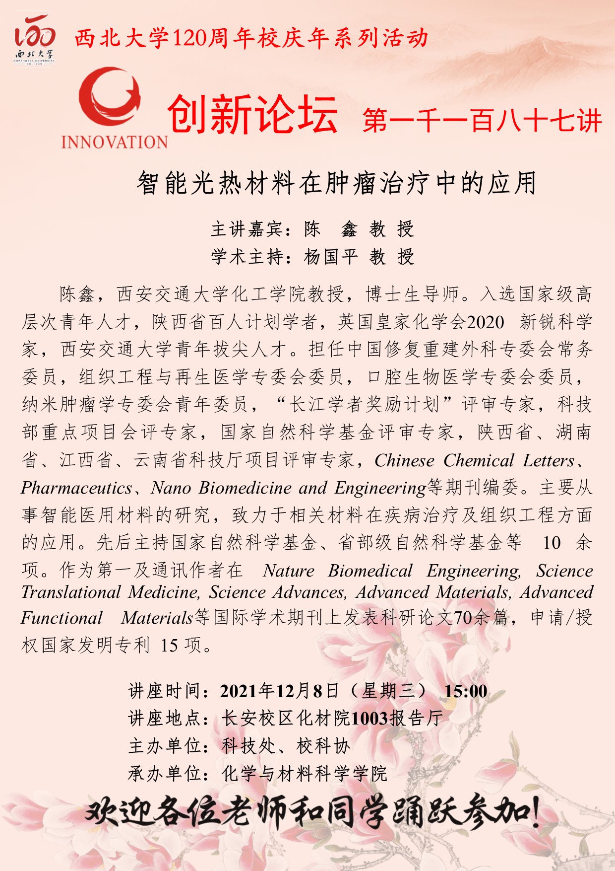 陈鑫 教授 BB平台创新论坛第一千一百八十七讲暨120周年校庆年系列活动:智能光热材料在肿瘤治疗中的应用 讲座时间 2021年12月8日(星期三) 15:00 讲座地点 长安校区化材院1003报告厅 讲座人介绍 陈鑫 教授 讲座内容