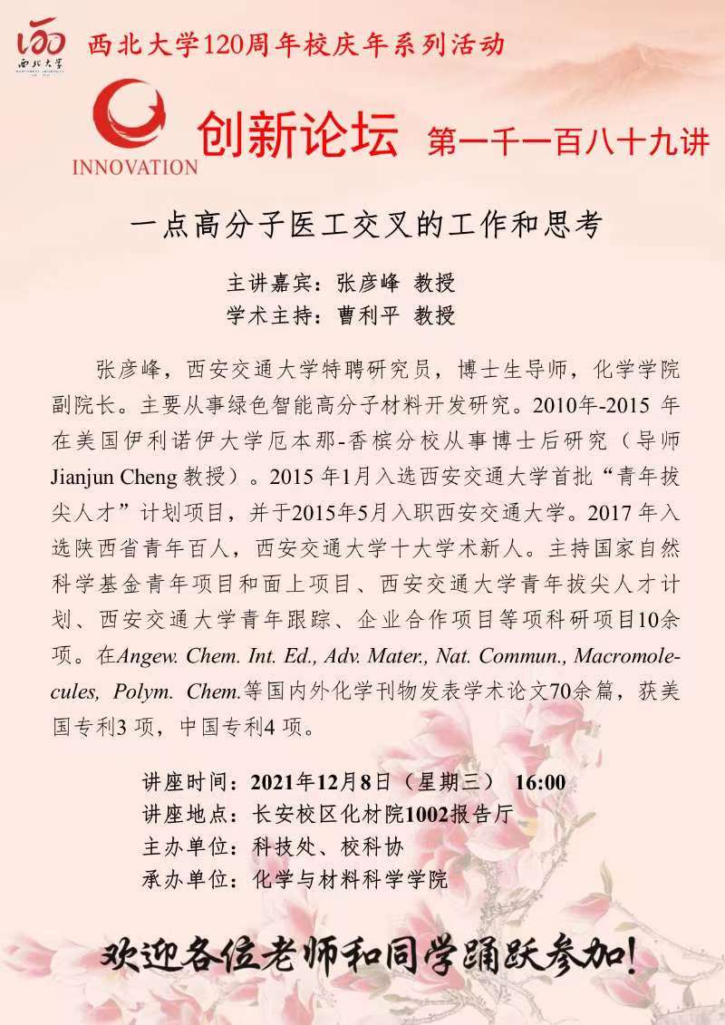 张彦峰 教授 BB平台创新论坛第一千一百八十九讲暨120周年校庆年系列活动:一点高分子医工交叉的工作和思考 讲座时间 2021年12月8日(星期三) 16:00 讲座地点 长安校区化材院1002报告厅 讲座人介绍 张彦峰 教授 讲座内容