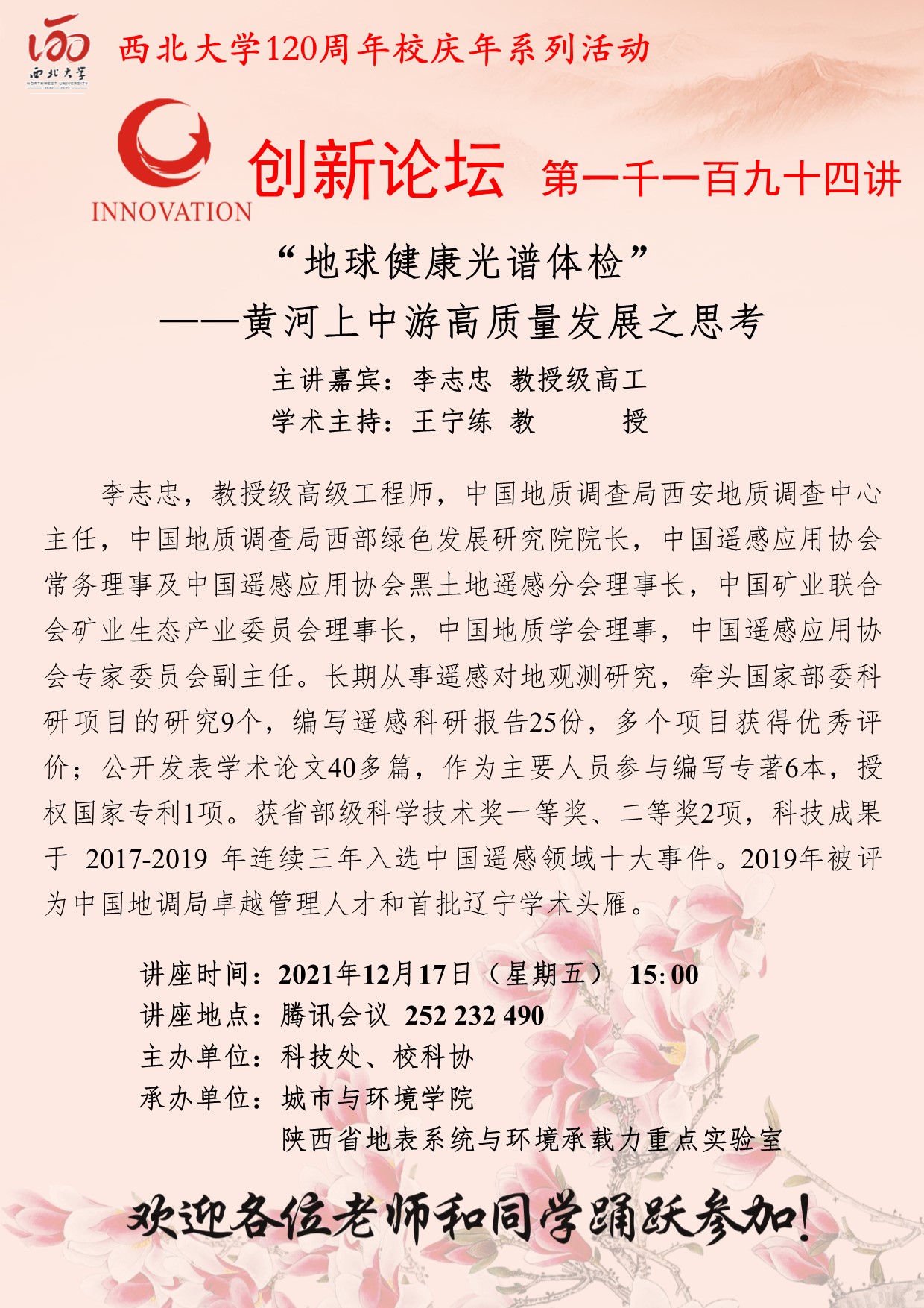 李志忠 教授级高工 BB平台创新论坛第一千一百九十四讲暨120周年校庆年系列活动:“地球健康光谱体检”——黄河上中游高质量发展之思考 讲座时间 2021年12月17日(星期五) 15:00 讲座地点 腾讯会议 252232490 讲座人介绍 李志忠 教授级高工 讲座内容