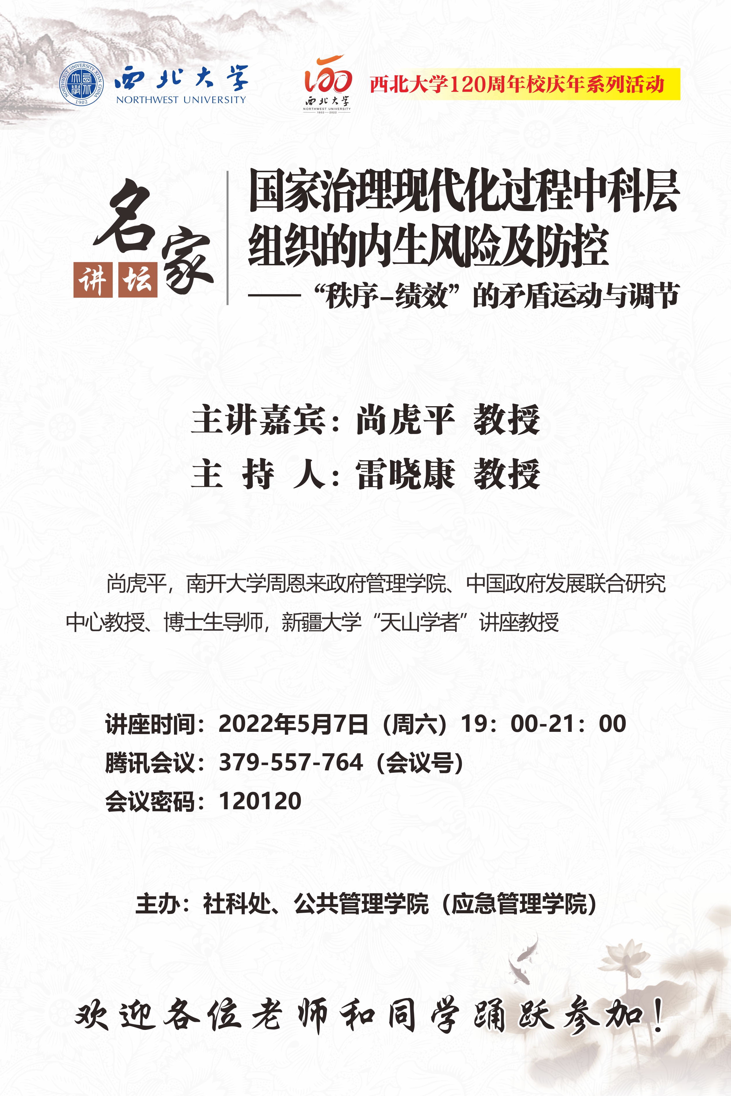 尚虎平 教授 BB(中国)120周年校庆年系列活动:国家治理现代化过程中科层组织的内生风险及防控 讲座时间 2022年5月7日(周六)19:00-21:00 讲座地点 腾讯会议:379557764 讲座人介绍 尚虎平 教授 讲座内容