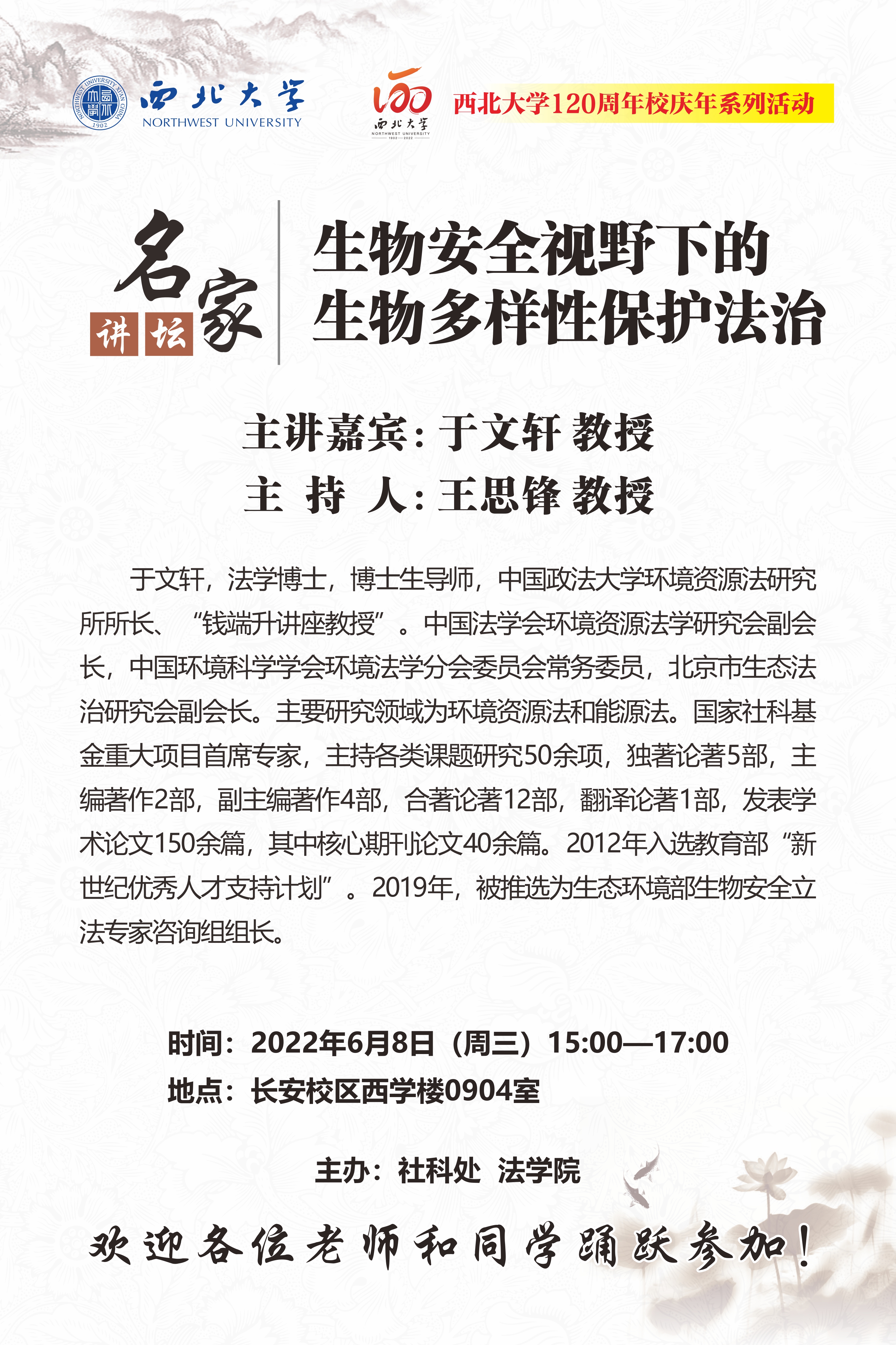 于文轩 教授 BB(中国)120周年校庆年系列活动:生物安全视野下的生物多样性保护法治 讲座时间 2022年6月8日(周三)15:00-17:00 讲座地点 长安校区西学楼0904室 讲座人介绍 于文轩 教授 讲座内容