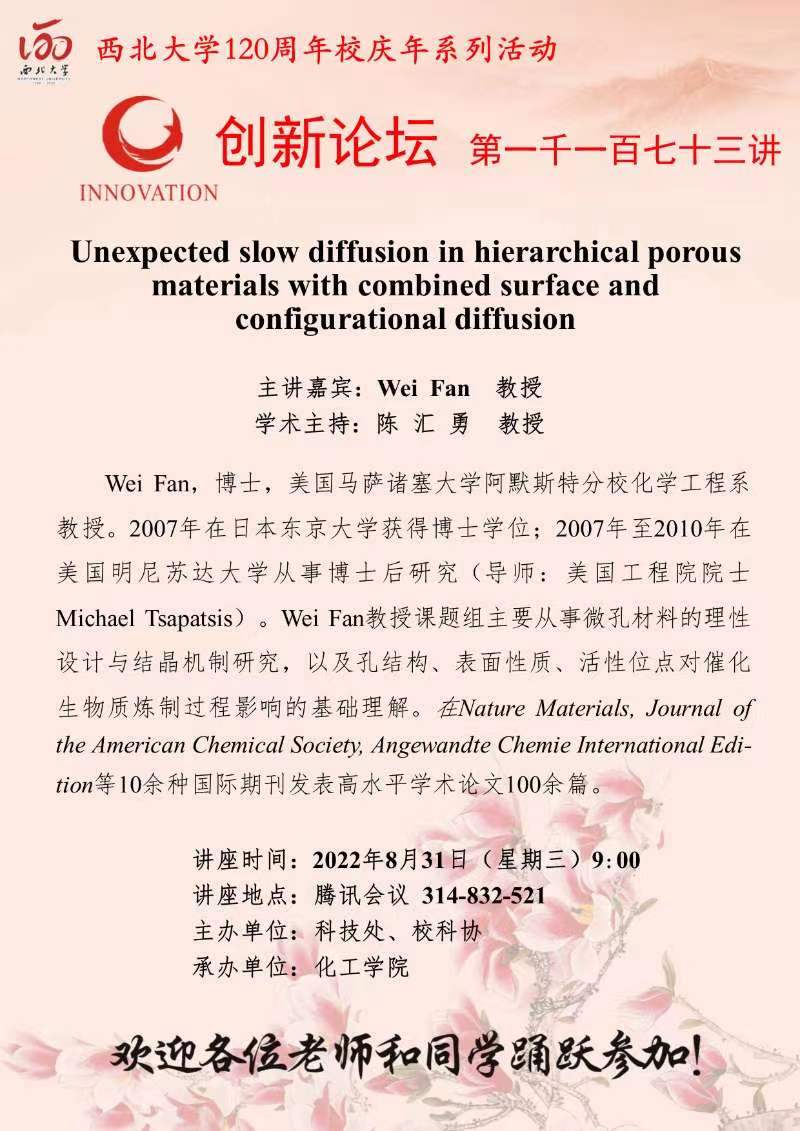 Wei Fan 教授 BB平台创新论坛第一千二百七十三讲暨120周年校庆年系列活动: Unexpected slow diffusion in hierarchical porous materials with combined surface and configurational diffusion 讲座时间 2022年8月31日(星期三)9:00 讲座地点 腾讯会议 314-832-521 讲座人介绍 Wei Fan 教授 讲座内容