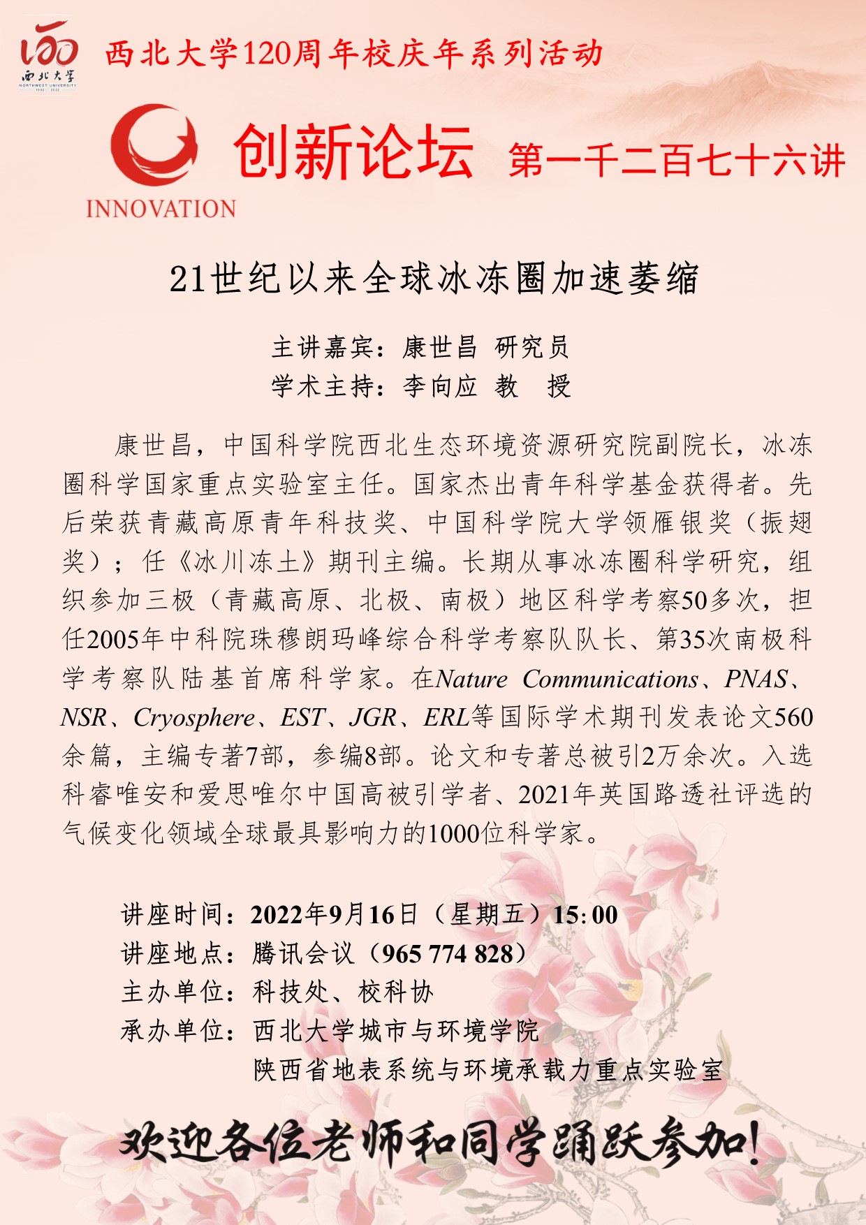 康世昌 研究员 BB平台创新论坛第一千二百七十六讲暨120周年校庆年系列活动:21世纪以来全球冰冻圈加速萎缩 讲座时间 2022年9月16日(星期五)15:00 讲座地点 腾讯会议(965 774 828) 讲座人介绍 康世昌 研究员 讲座内容