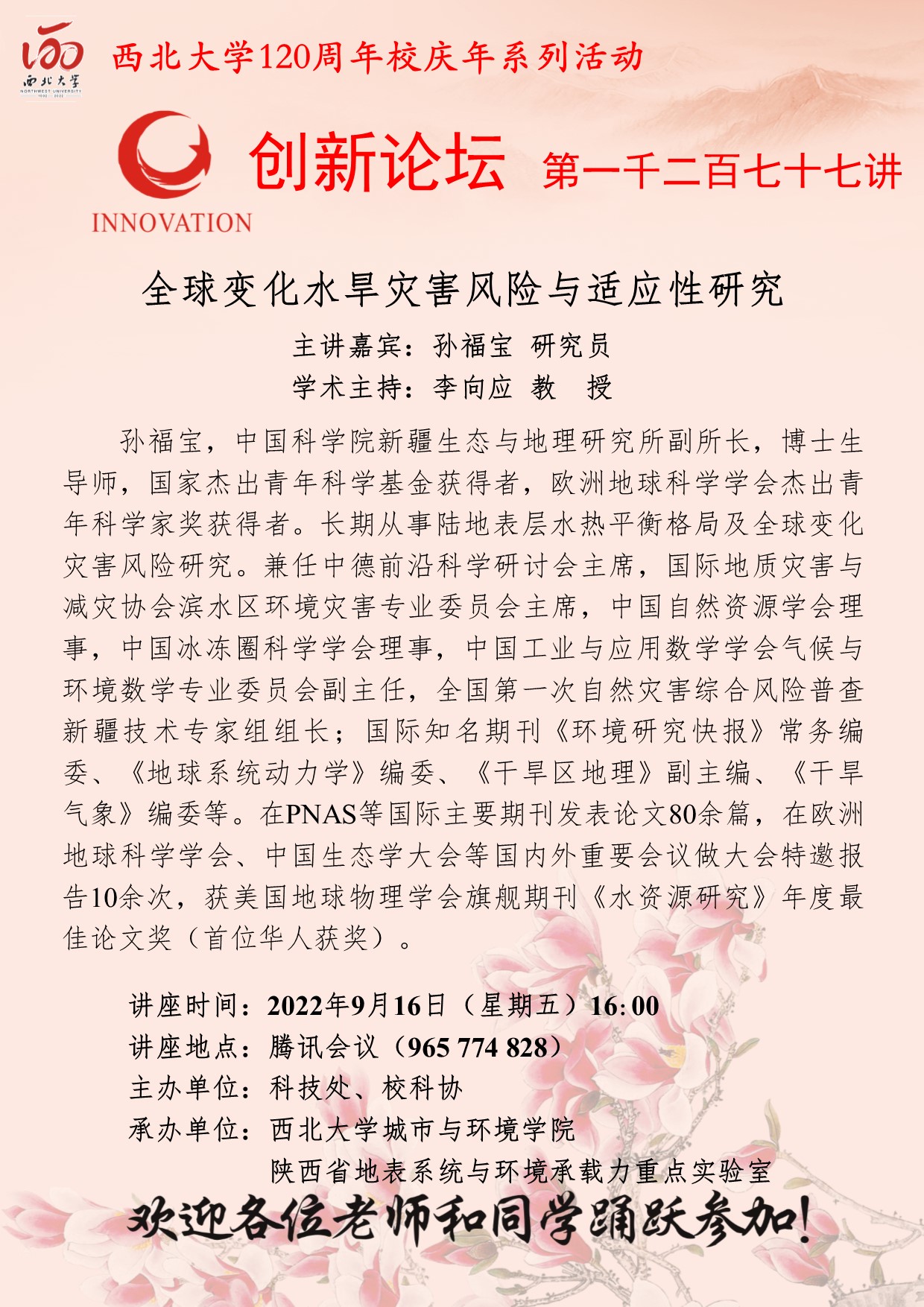 孙福宝 研究员 BB平台创新论坛第一千二百七十七讲暨120周年校庆年系列活动:全球变化水旱灾害风险与适应性研究 讲座时间 2022年9月16日(星期五)16:00 讲座地点 腾讯会议(965 774 828) 讲座人介绍 孙福宝 研究员 讲座内容