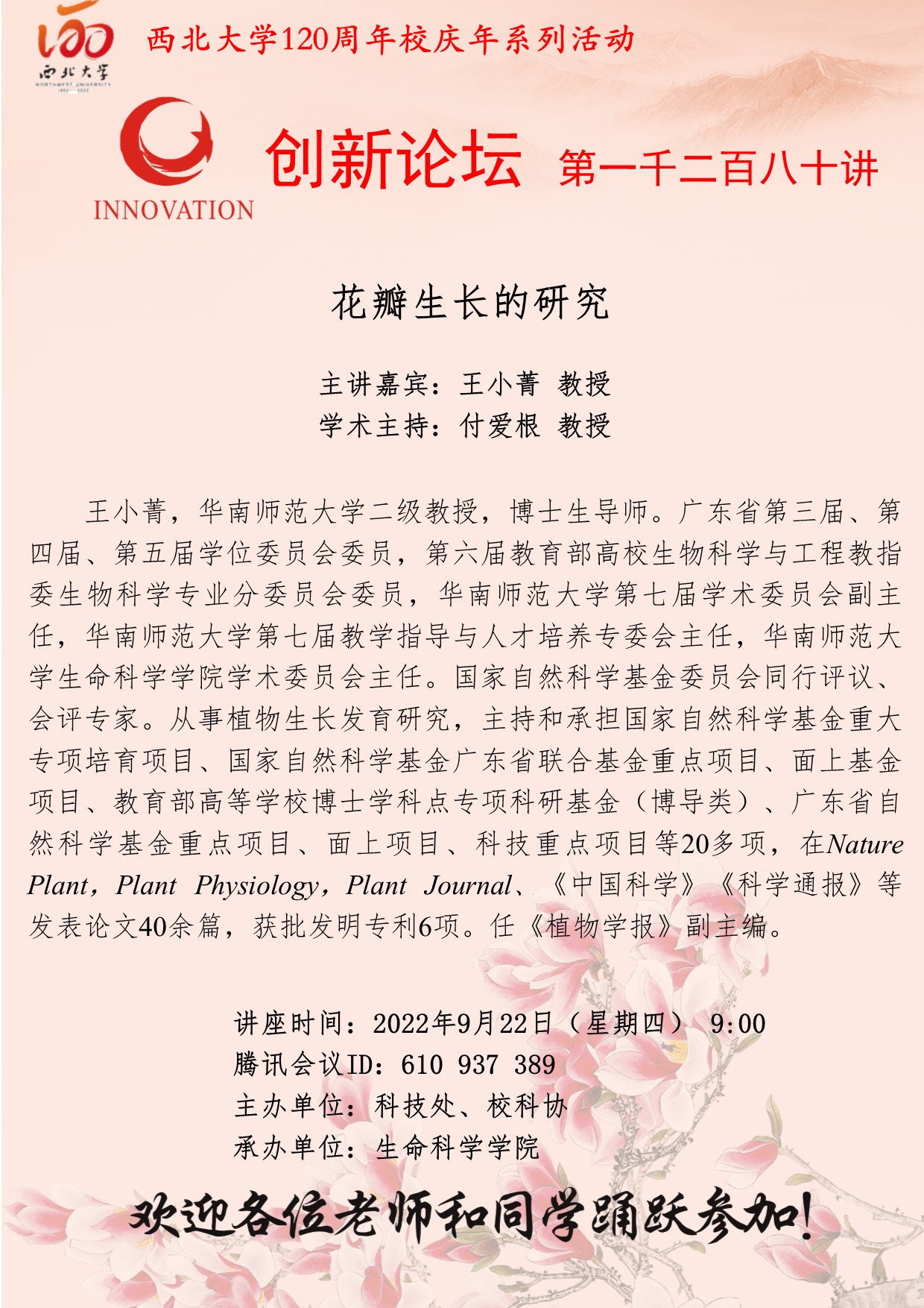 王小菁 教授 BB平台创新论坛第一千二百八十讲暨120周年校庆年系列活动:花瓣生长的研究 讲座时间 2022年9月22日(星期四) 9:00 讲座地点 腾讯会议ID:610 937 389 讲座人介绍 王小菁 教授 讲座内容