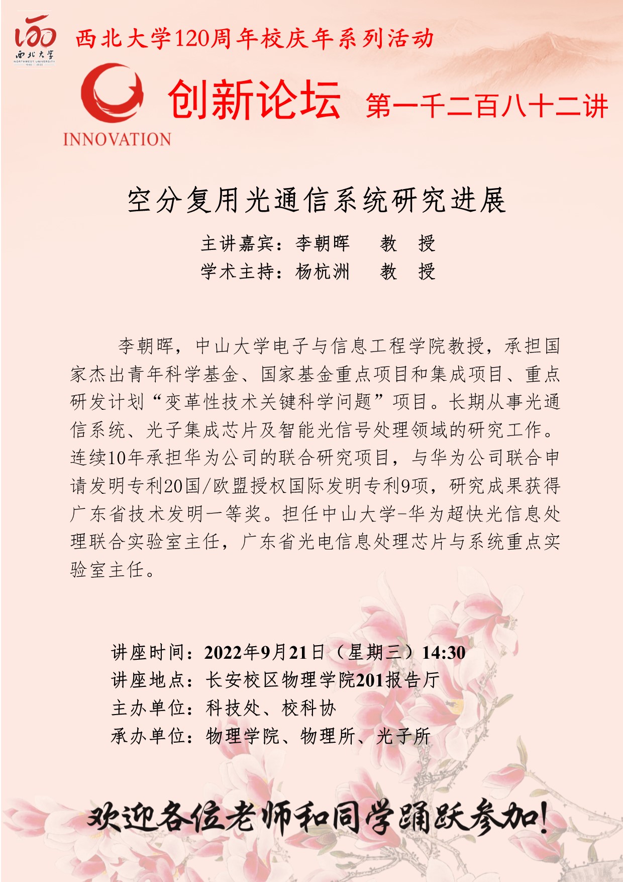 李朝晖 教授 BB平台创新论坛第一千二百八十二讲暨120周年校庆年系列活动::空分复用光通信系统研究进展 讲座时间 2022年9月21日(星期三) 14:30 讲座地点 物理学院201报告厅 讲座人介绍 李朝晖 教授 讲座内容