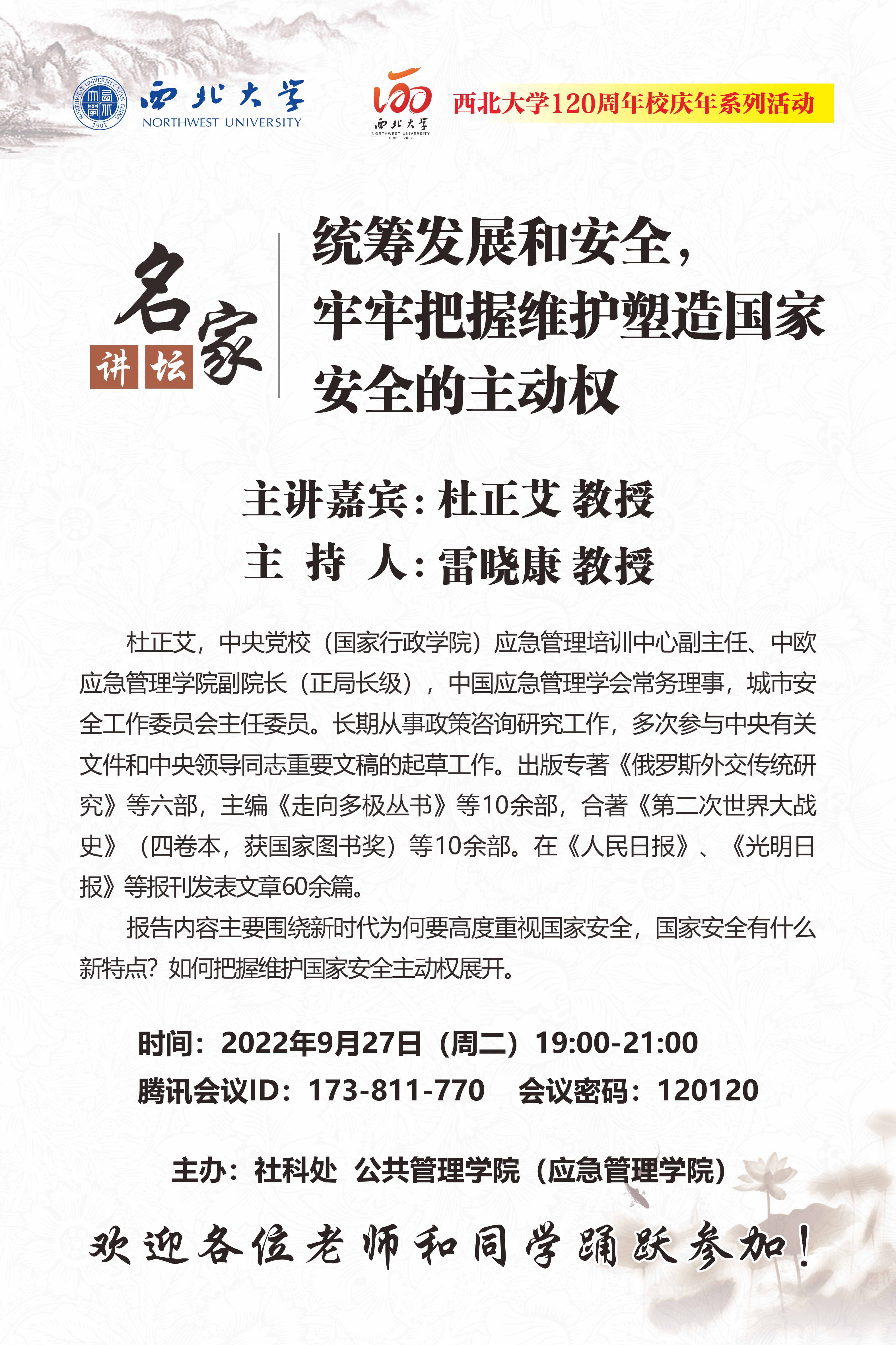 杜正艾 教授 BB(中国)120周年校庆年系列活动:统筹发展和安全,牢牢把握维护塑造国家安全的主动权 讲座时间 2022年9月27日(周二) 19:00-21:00 讲座地点 腾讯会议ID:173-811-770 讲座人介绍 杜正艾 教授 讲座内容