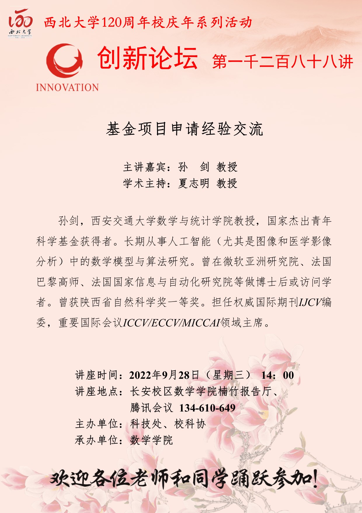 孙 剑 教授 BB平台创新论坛第一千二百八十八讲暨120周年校庆年系列活动:基金项目申请经验交流 讲座时间 2022年9月28日(星期三) 14:00 讲座地点 长安校区数学学院楠竹报告厅、腾讯会议 134-610-649 讲座人介绍 孙 剑 教授 讲座内容
