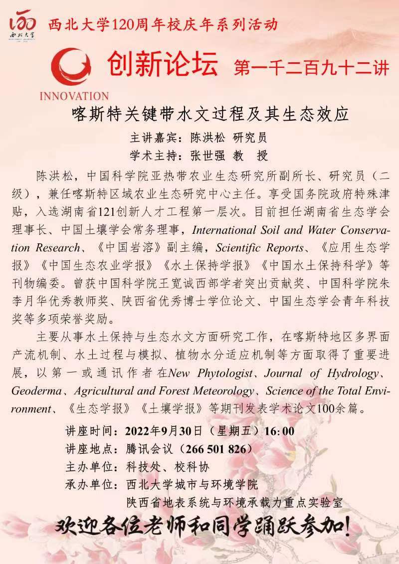 陈洪松 教授 BB平台创新论坛第一千二百九十二讲暨120周年校庆年系列活动: 喀斯特关键带水文过程及其生态效应 讲座时间 2022年9月30日(星期五) 16:00 讲座地点 腾讯会议 266 501 826 讲座人介绍 陈洪松 教授 讲座内容