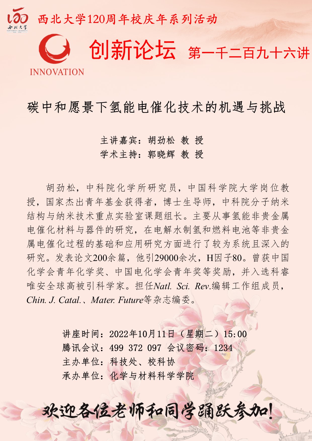 胡劲松 教授 BB平台创新论坛第一千二百九十六讲暨120周年校庆年系列活动: 碳中和愿景下氢能电催化技术的机遇与挑战 讲座时间 2022年10月11日(星期二)15:00 讲座地点 腾讯会议 499 372 097 会议密码 1234 讲座人介绍 胡劲松 教授 讲座内容