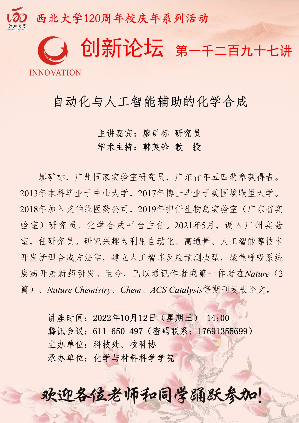 廖矿标 研究员 BB平台创新论坛第一千二百九十七讲暨120周年校庆年系列活动: 自动化与人工智能辅助的化学合成 讲座时间 2022年10月12日(星期三) 14:00 讲座地点 腾讯会议 611 650 497 讲座人介绍 廖矿标 研究员 讲座内容