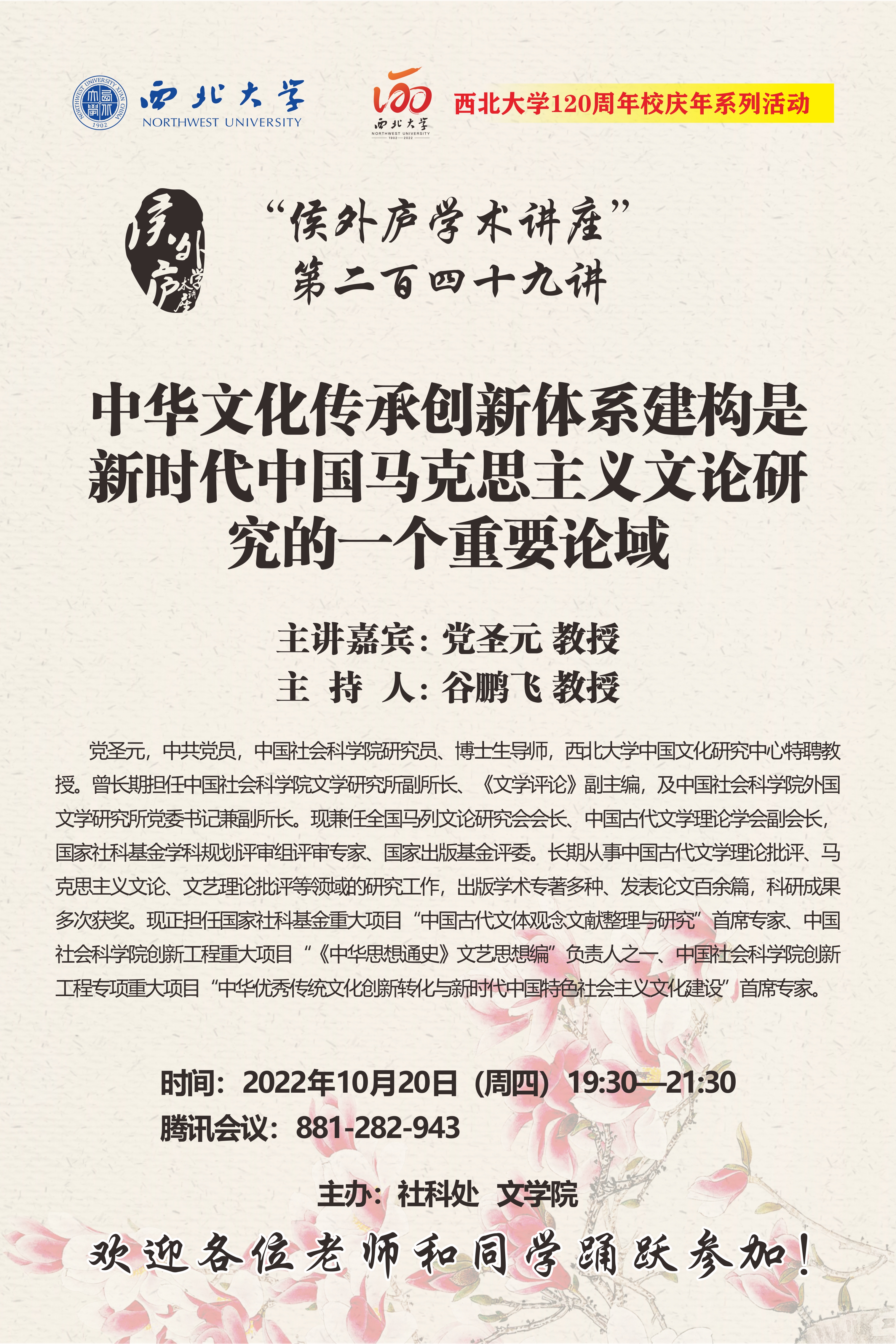 党圣元 教授 侯外庐学术讲座第二百四十九讲暨120周年校庆年系列活动:中华文化传承创新体系构建是新时代中国马克思主义文论研究的一个重要论域 讲座时间 2022年10月20日(周四)19:30 讲座地点 腾讯会议:881282943 讲座人介绍 党圣元 教授 讲座内容