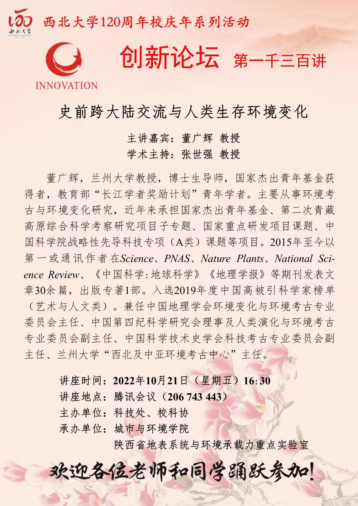 董广辉 教授 BB平台创新论坛第一千三百讲暨120周年校庆年系列活动: 史前跨大陆交流与人类生存环境变化 讲座时间 2022年10月21日(星期五)16:30 讲座地点 腾讯会议 206 743 443 讲座人介绍 董广辉 教授 讲座内容