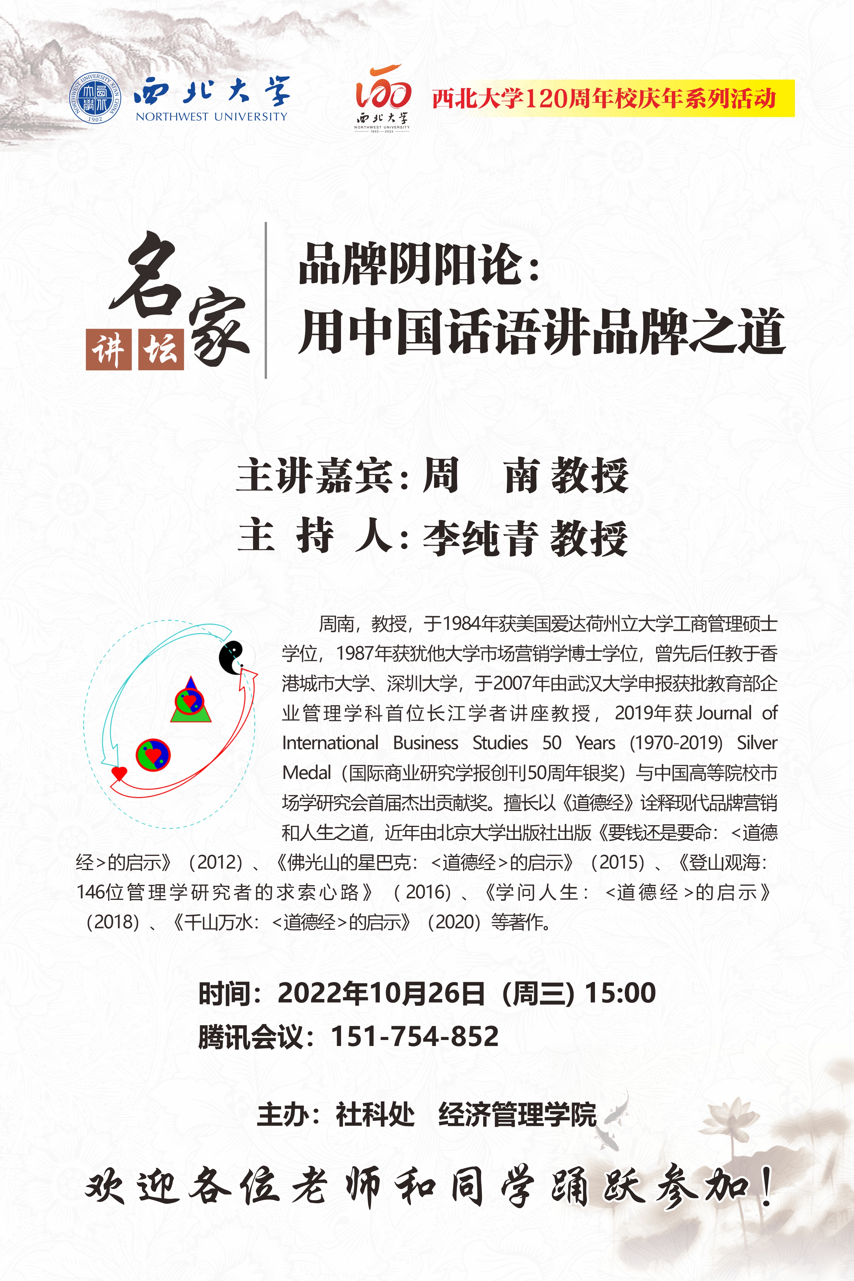 周南 教授 BB(中国)120周年校庆年系列活动:品牌阴阳论:用中国话语讲品牌之道 讲座时间 2022年10月26日(周三)15:00 讲座地点 腾讯会议:151754852 讲座人介绍 周南 教授 讲座内容