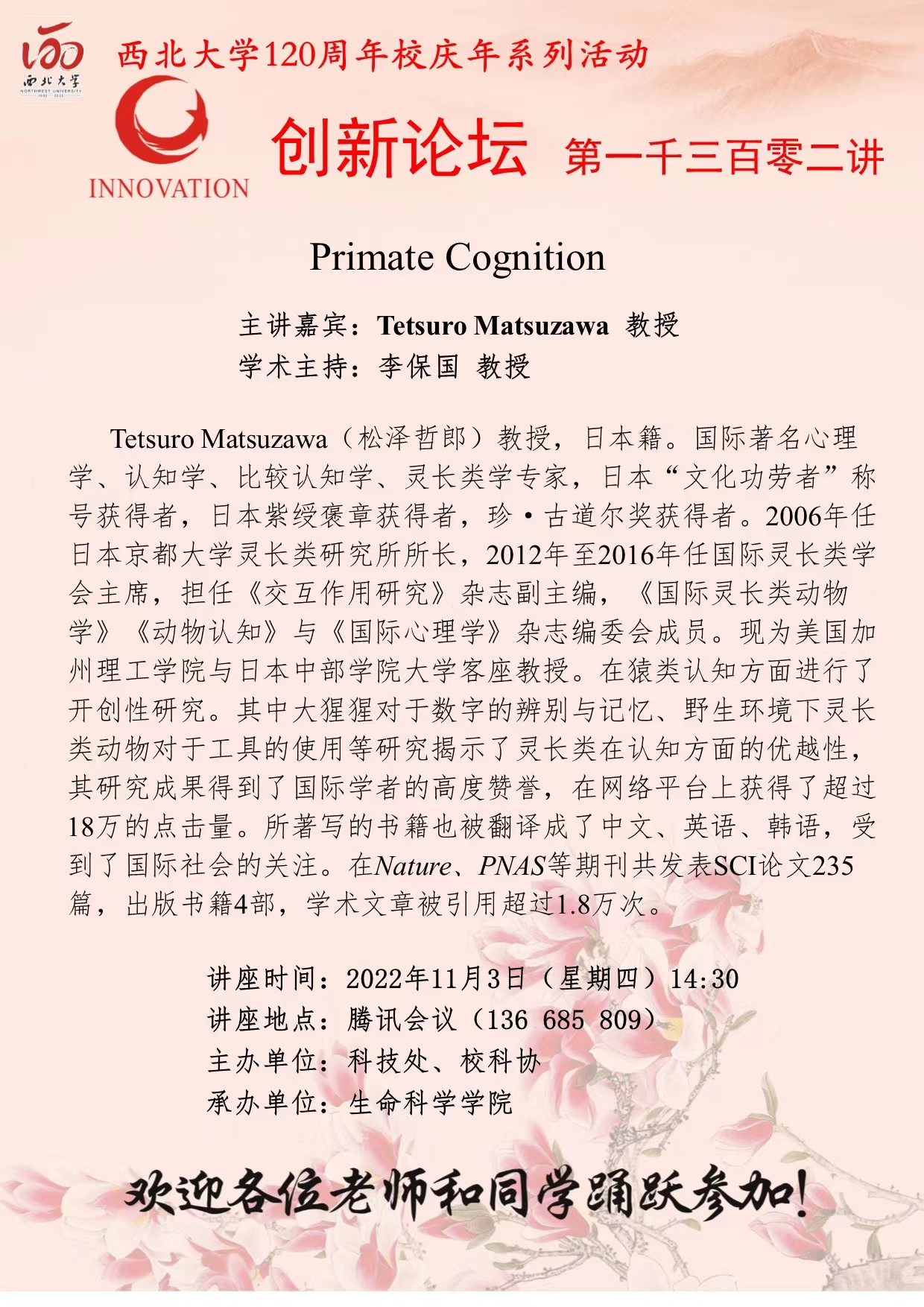 Tetsuro Matsuzawa 教授 BB平台创新论坛第一千三百零二讲暨120周年校庆年系列活动: Primate Cognition 讲座时间 2022年11月3日(星期四)14:30 讲座地点 腾讯会议 136 685 809 讲座人介绍 Tetsuro Matsuzawa 教授 讲座内容