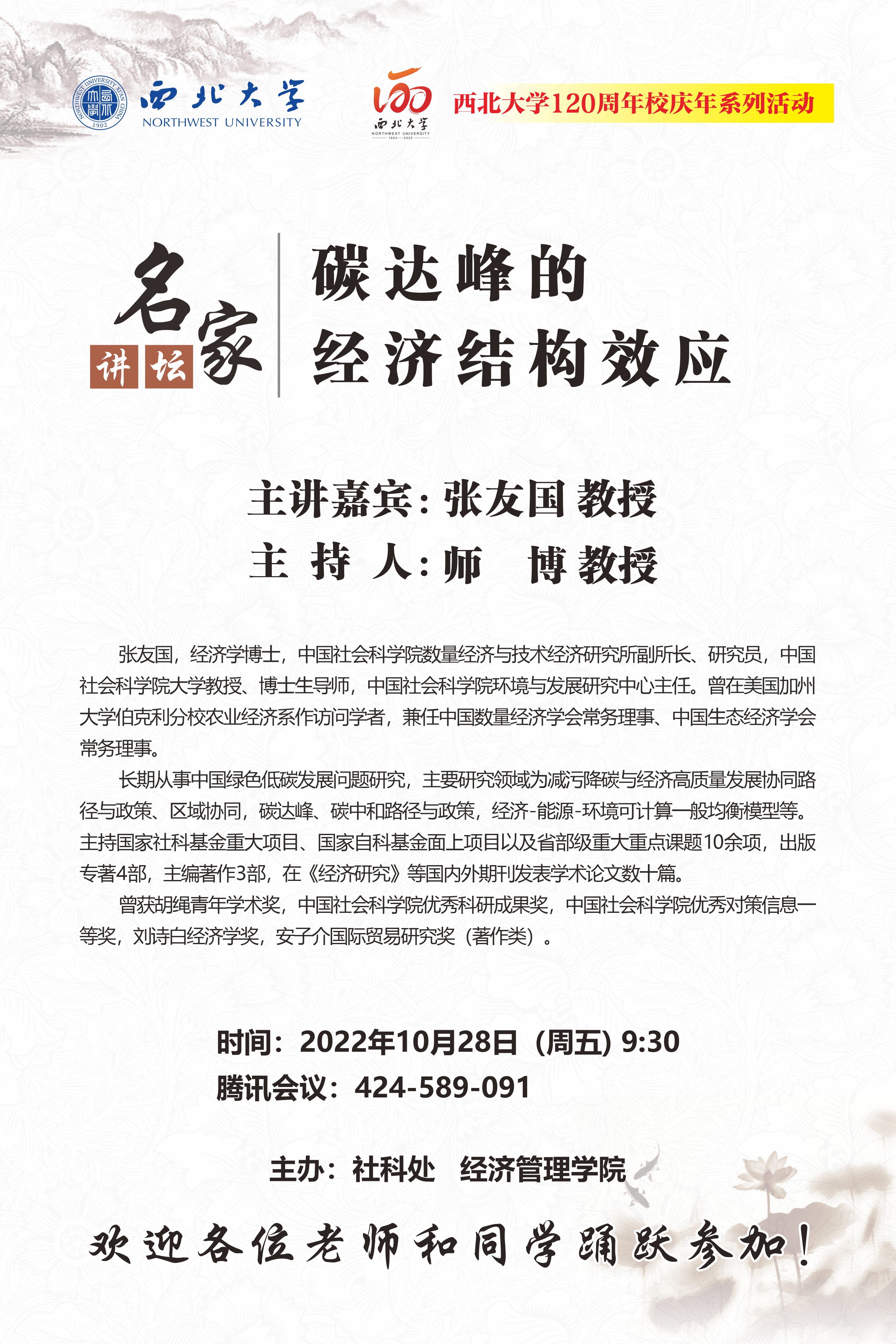 张友国 教授 BB(中国)120周年校庆年系列活动:碳达峰的经济结构效应 讲座时间 2022年10月28日(周五)9:30 讲座地点 腾讯会议:424-589-091 讲座人介绍 张友国 教授 讲座内容