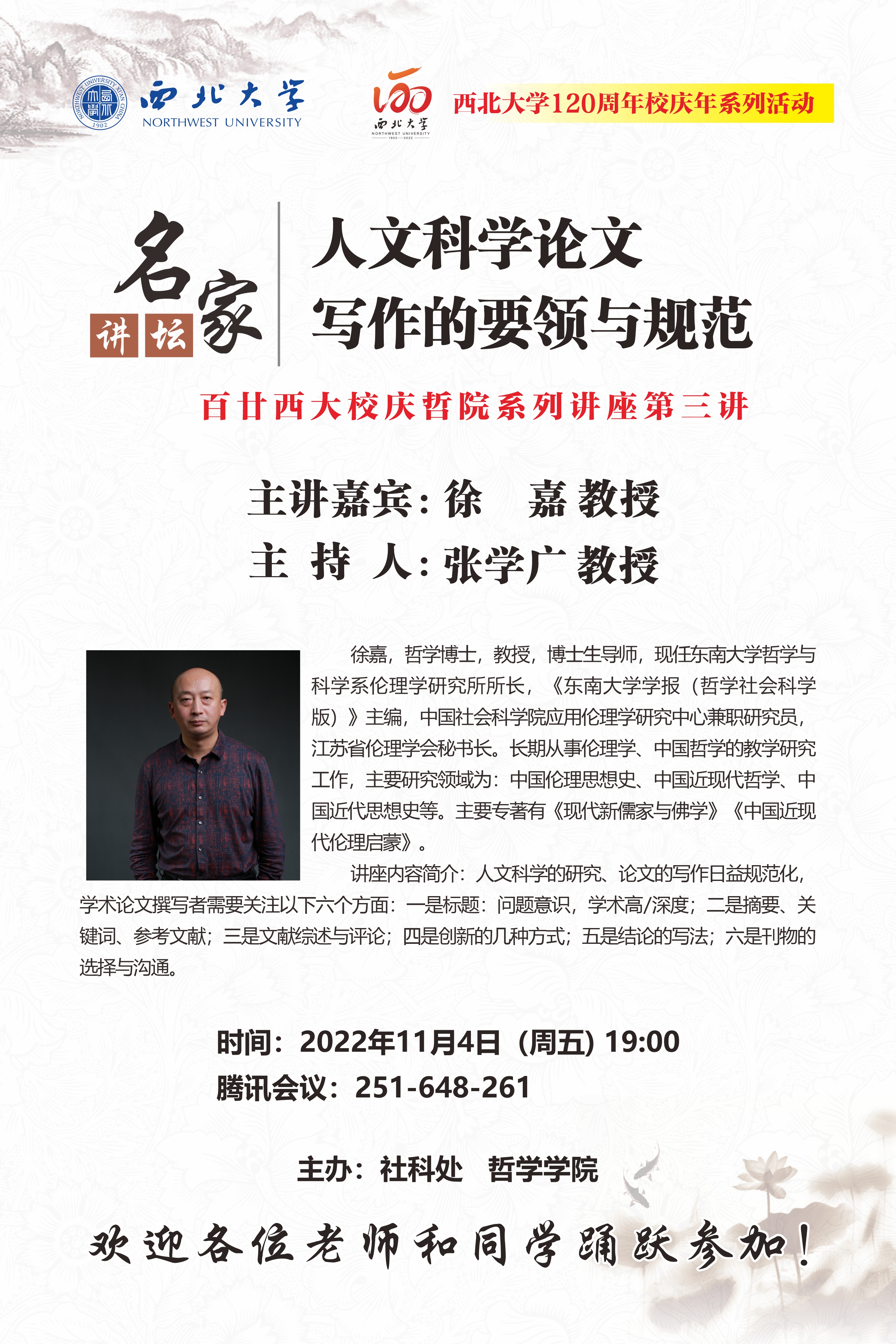徐嘉 教授 BB(中国)120周年校庆年系列活动:人文科学论文写作的要领与规范 讲座时间 2022年11月4日(周五)19:00 讲座地点 腾讯会议:251-648-261 讲座人介绍 徐嘉 教授 讲座内容