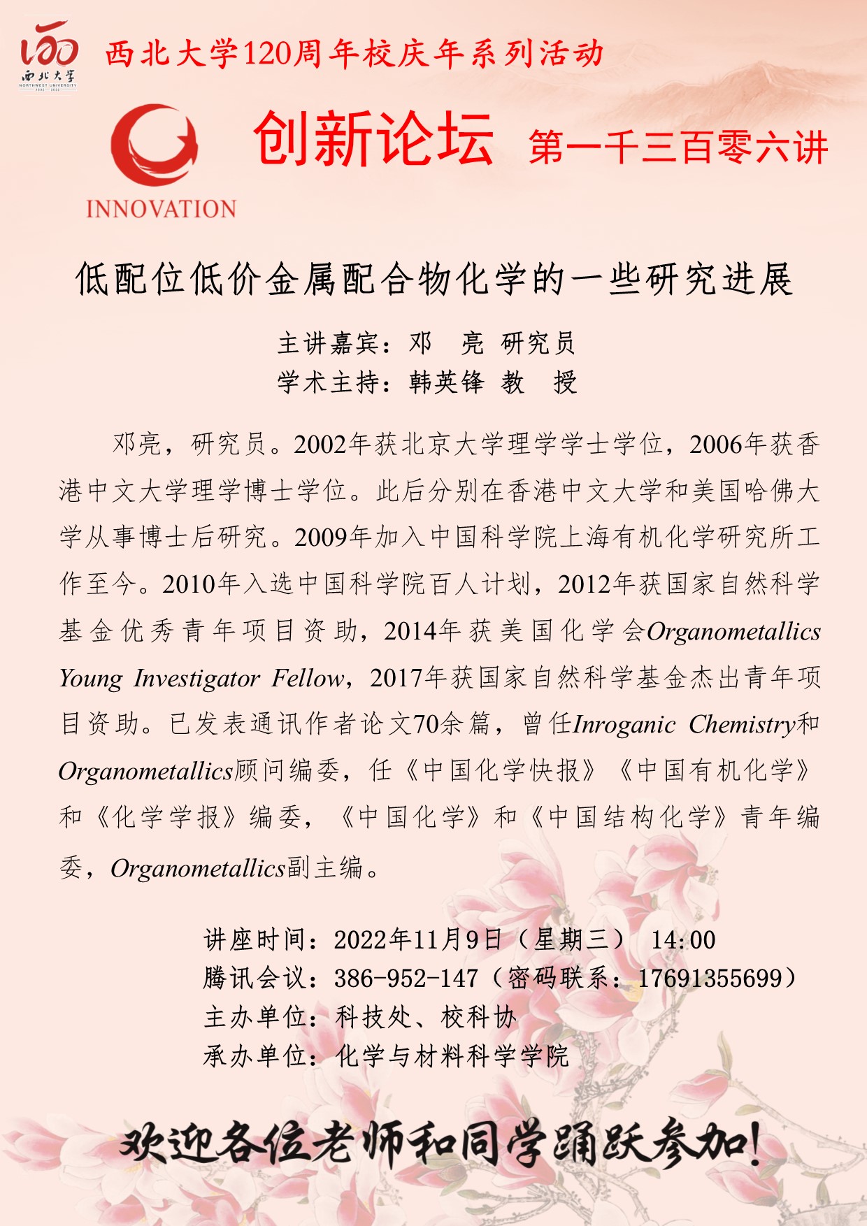 邓亮 研究员 BB平台创新论坛第一千三百零六讲暨120周年校庆年系列活动: 低配位低价金属配合物化学的一些研究进展 讲座时间 2022年11月9日(星期三) 14:00 讲座地点 腾讯会议 386-952-147 讲座人介绍 邓亮 研究员 讲座内容